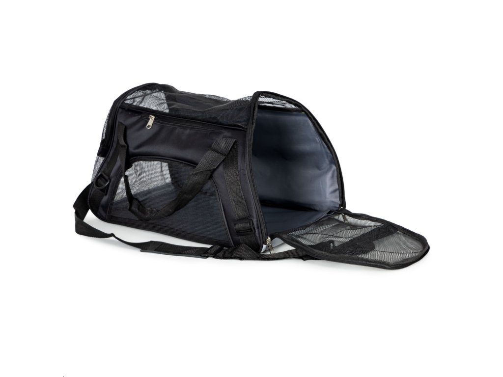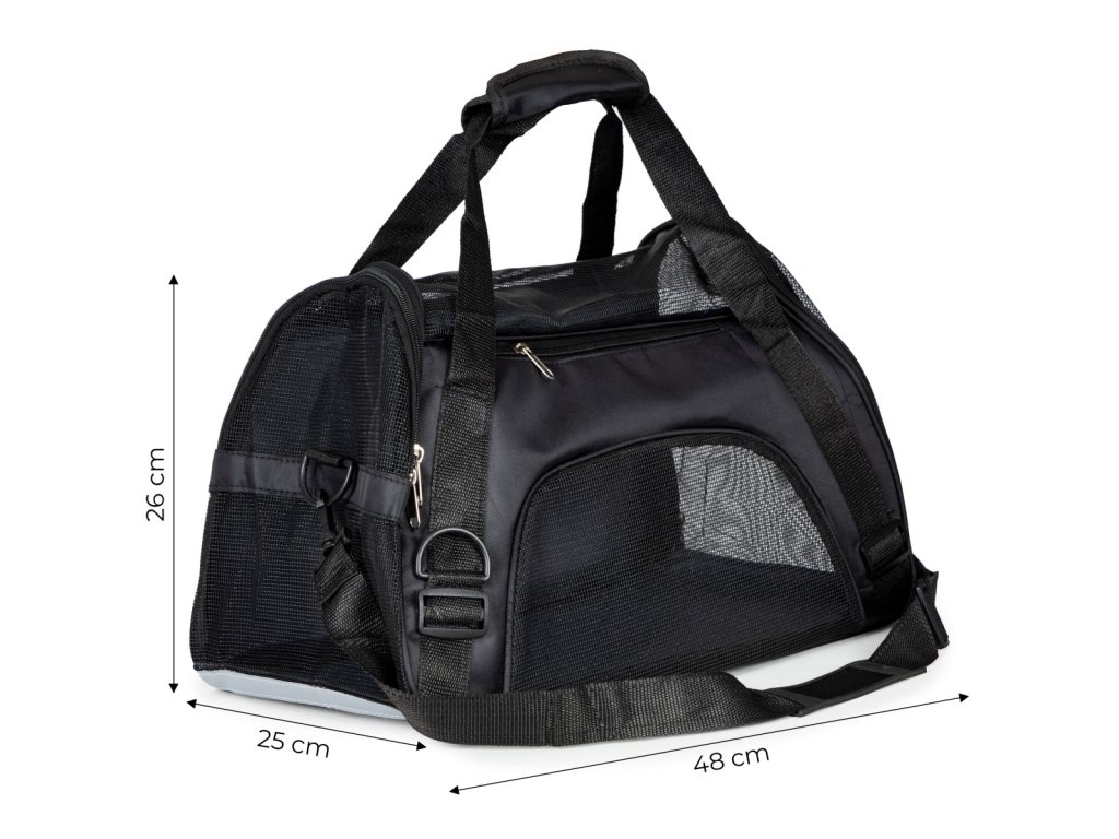 Transportér pro psa a kočku Petsi 48 cm – přepravní taška do auta černá do 12 kg. Praktický transportér pro psa nebo kočku je ideální řešení pro bezpečné cestování autem, vlakem i při návštěvě veterináře. Zajišťuje pohodlí zvířete a zároveň chrání okolí před nečistotami. Ideální na cesty. Vyroben z odolného a pevného materiálu, který zajišťuje stabilitu a dlouhou životnost. Transportér je otevíratelný ze dvou stran, což umožňuje snadné vkládání a vyjímání zvířete. Vhodný pro psy i kočky do hmotnosti 12 kg. Promyšlená konstrukce. Boční i horní části jsou vybaveny ventilační síťovinou, která zajišťuje optimální cirkulaci vzduchu. Zvíře může pohodlně dýchat a zůstává v bezpečném prostředí. Vyztužené dno poskytuje stabilitu a komfort během přepravy. Pohodlí a praktičnost. Transportér lze nosit v ruce nebo přes rameno. Součástí je praktická kapsa na vodítko, pamlsky nebo doklady. Vnitřní podložku lze vyjmout a snadno vyčistit. Technické informace. Rozměry: 26 × 48 × 25 cm. Maximální nosnost: 12 kg. Barva: černá. Hmotnost: 0,6 kg. Materiál: odolné syntetické vlákno. Značka: Petsi. Upozornění: Výrobek není hračka. Používejte výhradně dle pokynů výrobce. Před použitím vždy zkontrolujte stav výrobku. Obal není hračka, odstraňte jej z dosahu dětí.Doplňkové parametry