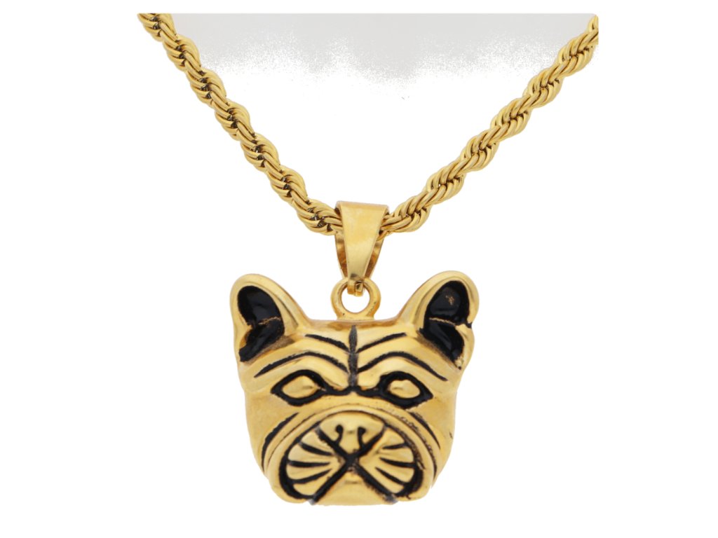 PŘÍVĚSEK BULDOG Z CHIRURGICKÉ OCELI s řetízkem ve zlaté barvě. Výška přívěsku 3,3cm, šířka 3cm, tl. 0,2cm, průměr očka 0,8 cm. Řetízek rozměry délka 50 cm, tlouštka řetízků 3,2 mm.