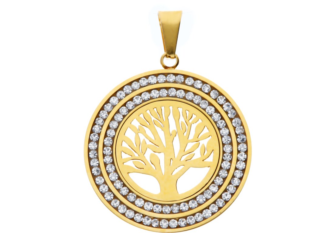 Přívěsek strom života s krystaly ve zlaté barvě. Rozměry průměr 3,4 cm, průměr očka 0,45 cm, váha 14 g. Dárková krabička zdarma. Materiál chirurgická ocel.