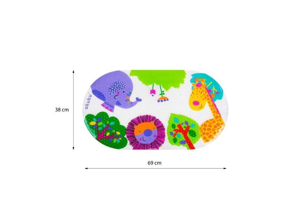 Dětská protiskluzová podložka do vany akuku pro bezpečné koupání. Praktická protiskluzová podložka akuku je určená do dětské vaničky, klasické vany i sprchového koutu. Pomáhá zvyšovat bezpečnost při koupání a díky barevnému potisku promění běžnou hygienu v příjemný rituál pro děti i rodiče. Proč si ji zamilujete. Zvyšuje bezpečnost během koupele a snižuje riziko uklouznutí. Má přísavky, které spolehlivě brání posouvání podložky. Snadno se používá a rychle připraví před každou koupelí. Protiskluzový povrch pomáhá stabilitě dítěte při vstupu do vody i během mytí. Neobsahuje ftaláty a je vyrobena z kvalitního PVC. Barevný potisk zpříjemní každodenní péči a zaujme dětskou pozornost. Návod k použití. Nejprve napusťte do vany vodu na požadovanou úroveň. Poté vložte podložku do vany potiskem nahoru a rovnoměrně ji přitlačte, aby se přísavky pevně přichytily k povrchu. Po každé koupeli podložku omyjte s přidáním dětského mýdla, opláchněte čistou vodou a nechte volně vyschnout. Parametry a materiál. Materiál: vysoce kvalitní PVC bez ftalátů. Produkt je zcela bez bisfenolu A, 0 % BPA. Rozměry podložky: 69 × 39 cm. Balení obsahuje 1 kus. Bezpečnostní upozornění. Během koupele musí být dítě vždy pod dohledem dospělé osoby. Podložku nedezinfikujte, nepolévejte vroucí vodou, nevařte a nemyjte v myčce nádobí. V případě známek opotřebení výrobek vyřaďte z používání. Před prvním i každým dalším použitím zkontrolujte stav podložky a správné přilnutí přísavek. Tato protiskluzová podložka akuku je chytrým pomocníkem pro bezpečnější koupání miminek a malých dětí. Díky stabilnímu uchycení, snadné údržbě a příjemnému designu přináší klid a komfort celé rodině.Doplňkové parametry