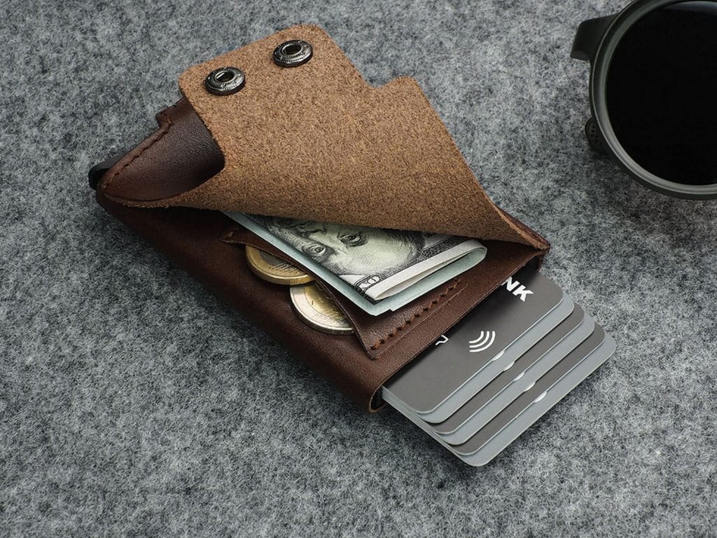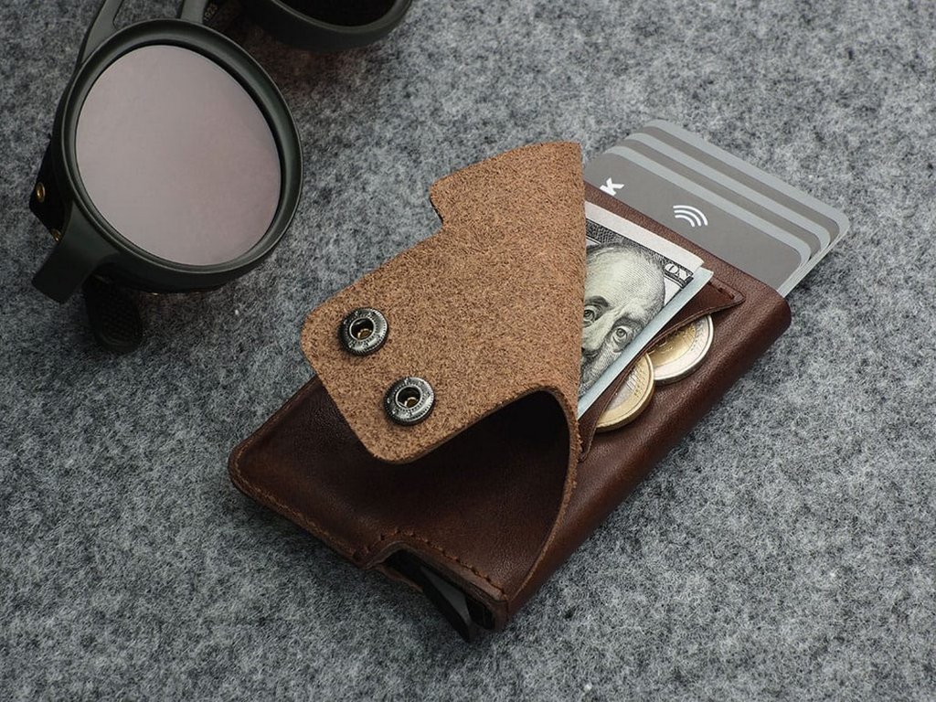 Peněženka byla vyrobena ze speciálně rostlinně činěné kůže Nomad, která byla máčena v oleji, díky čemuž pak přirozeně stárne a získává vintage nádech. Leštěním je ale možné peněžence navrátit původní vzhled. Peněženka chrání peníze a citlivá data pomocí technologie RFID, která funguje jako ochrana před neautorizovaným skenováním čipových karet.