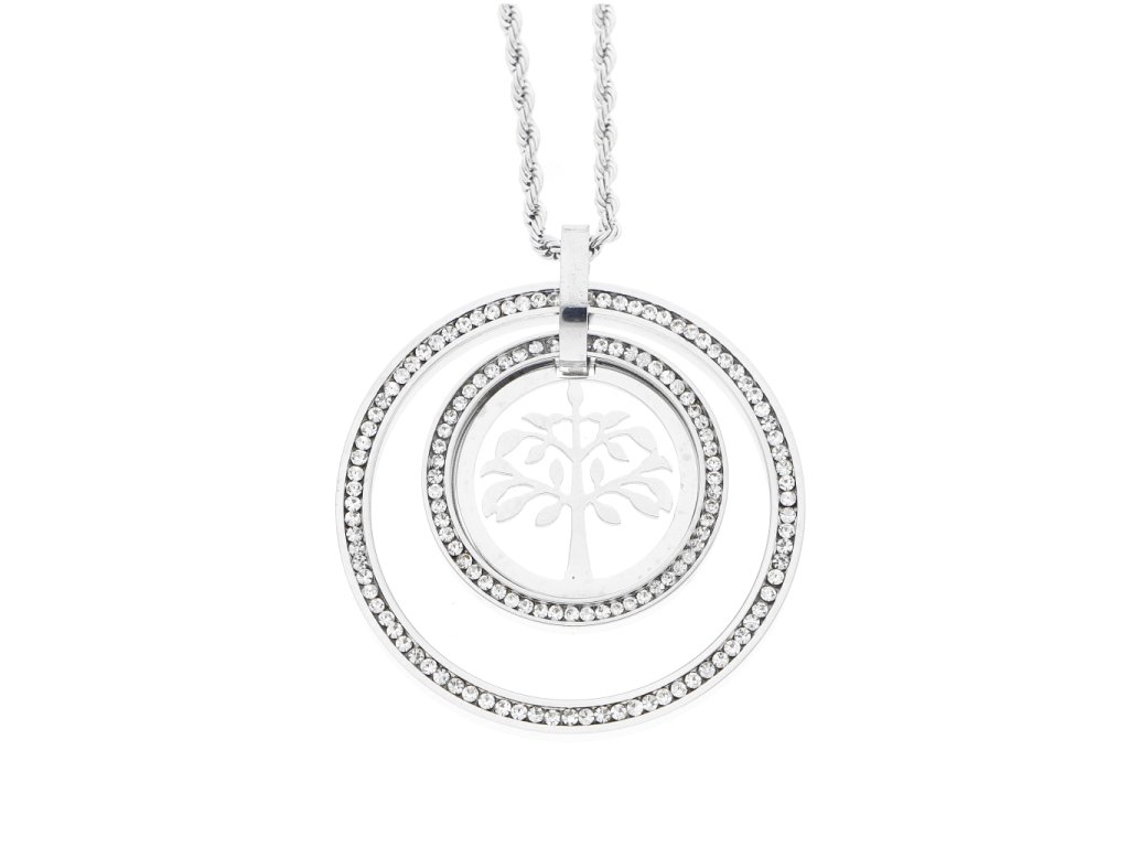 Řetízek s přívěskem strom života s krystaly. Rozměry přívěsek, průměr 4 cm, tloušťka 0,3 cm, řetízek 50 cm , tloušťka 0,2 cm. Materiál chirurgická ocel. Dárkové balení.