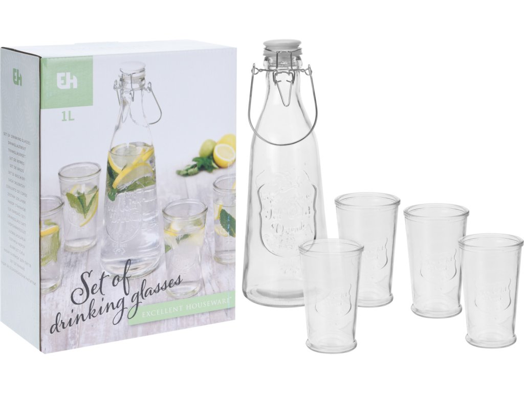 Karafu lze využít mnoha způsoby - k podávání džusu, vody. Díky jednoduchému designu lze karafu používat doma i v restauracích a kavárnách. Karafa a skleničky jsou vyrobeny z kvalitního skla, zdobí je vintage vzor. Objem karafy 1l, objem sklenic 250ml.