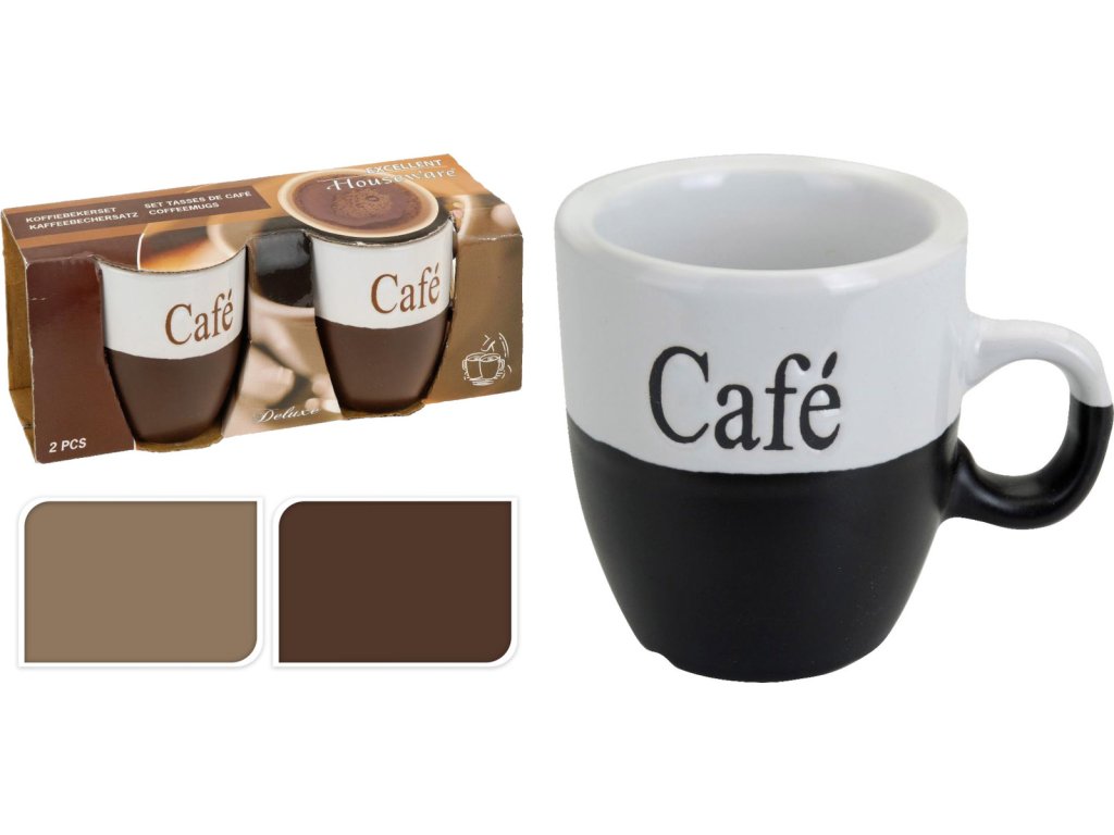 Sada 2ks šálků na kávu z kvalitního porcelánu. Vynikající jako dárek pro všechny věkové kategorie. sada přijde vhod při různých příležitostech k servírování kávy, čaje, kakaa. Zpříjemněte si čas strávený ve společnosti oblíbeného nápoje. Lze mýt v myčce a používat v mikrovlnné troubě. Barva - černá/bílá, hnědá/bílá.