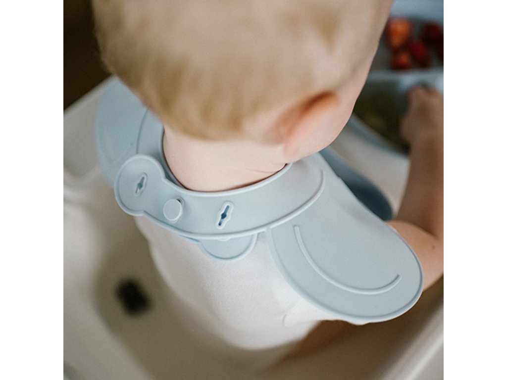 Silikonový bryndák s regulovaným zapínáním a kapsičkou, modrý