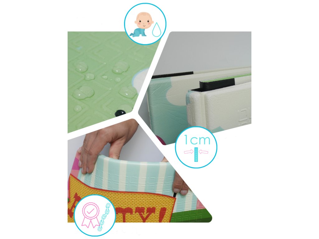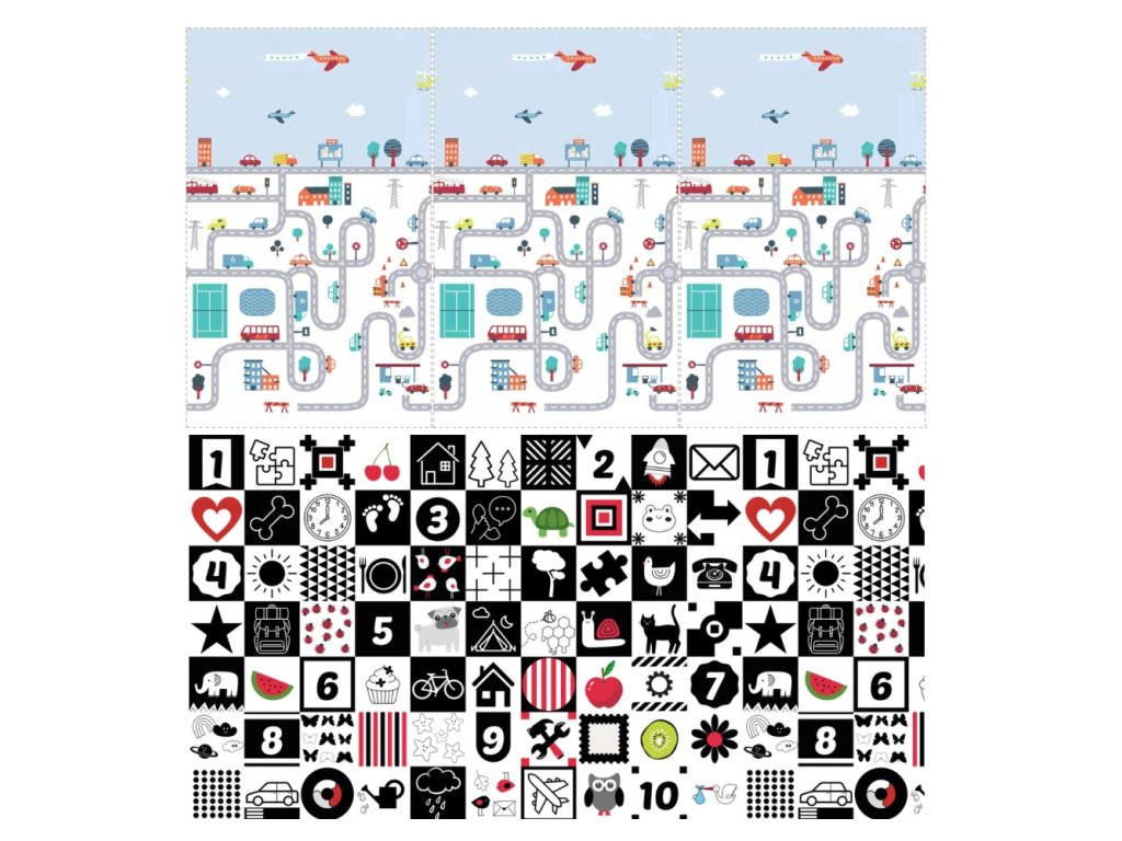 Díky své vysoké hustotě a elasticitě absorbuje všechny pády, kterým je vaše ratolest vystavena při plazení, učení se sedět, chodit a hrát si. Podložka je velmi odolná a můžete si být jisti, že ji vaše dítě bude používat velmi dlouho. Na povrchu má protiskluzovou strukturu a skvěle izoluje od studené podlahy. Bezpečnost zaručena! Protože jako rodiče víme, že je to důležitý prvek v každém produktu pro děti. Pěnové podložka neobsahují formamid, ftaláty, PVC ani Bisfenol A. Podložka má rozměry 200 x 150 cm a je složená na formát: 40 x 75 x 10 cm. Vodotěsná - skládací podložka pro děti, neabsorbuje vlhkost a nepropouští ji. Díky tomu ochrání podlahu před náhodným politím např. nápojem nebo mlékem. Snadno se čistí - stačí otřít mokrým hadříkem nebo vodou s čisticím prostředkem na hračky. Dobré tlumení nárazů - díky dvěma vlastnostem - vysoké hustotě a velké tloušťce je pěnová podložka výborným základem pro hraní. Výuková skládací podložka dobře poslouží jak při změně polohy, tak při učení plazení, jako ochrana před tvrdou podlahou. Dobrá izolace - pěna XPE, ze které je dětská podložka vyrobena, poskytuje dobrou tepelnou izolaci. Díky podložce si můžete být jisti, že vaše dítě nebude vystaveno přímému kontaktu se studenou podlahou. Skládací karimatka - dětská karimatka nabízená naší společností je model, který se bude skvěle hodit jak na doma, tak na cesty. Díky své skládací schopnosti zabere velmi málo místa. Taška v ceně - díky přiložené tašce si můžete být jisti, že se karimatka při přepravě neušpiní. Uši potahu na dětskou karimatku XXL usnadňují přepravu. Intenzivní barvy na podložce zajistí skvělou zábavu a bude pěkným doplňkem výzdoby dětského pokoje. Vaše dítě může podložku používat od prvních dnů života! Edukativní podložka pro dítě je skvělou náhradou koberce nebo dek. Vzdělávací podložka splňuje všechny evropské normy. Pěnová podložka pro děti je oboustranná - strany můžete libovolně používat.. Obrázky s černobílými kontrastními vzory je speciálně navržen pro nejmenší děti - novorozence a kojence. To jsou barvy, které jsou pro ně nejzajímavější. Existují také čísla, která pomohou starším dětem učit se. Podložka je dostatečně odolná, aby ji mohla používat od novorozence až po předškoláka!Doplňkové parametry