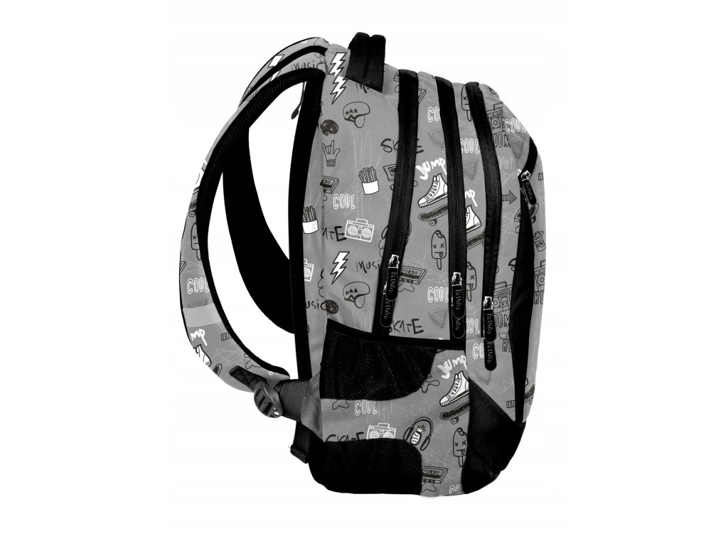 Školní dětský batoh s motivem Skate. Funkční pohodlný batoh obsahuje dvě velké kapsy na zip. V hlavní kapse je přihrádka na notebook, v druhé kapse je organizér s kapsou na zip a držákem na klíče. Z vnější strany je menší kapsa a po bocích dvě kapsy. Díky ergonomicky tvarovaným zádům a polstrovaných nastavitelných ramenních popruhů je nošení batohu velmi pohodlné. Batoh je vyrobený s odolného materiálu. Spodní strana batohu je pokrytá gumou, která chrání proti nečistotám a vlhkosti.