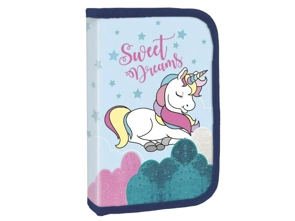 Rozkládací školní penál s nádherným designem jednorožce na nebesky modrém pozadí s hvězdami, je dokonalým spojením pohádkového stylu a funkčnosti pro každou školačku.