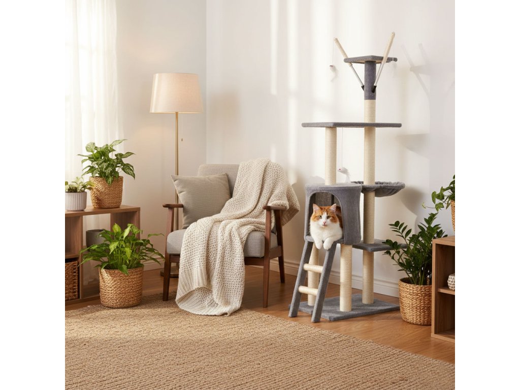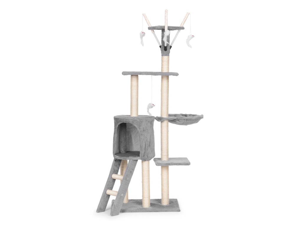 Škrabadlo pro kočku 134 cm s domečkem a hamakem Petsi – šedé. Vysoké a stabilní škrabadlo pro kočky 134 cm nabízí ideální kombinaci prostoru pro škrábání, šplhání, odpočinek i hru. Moderní šedé provedení se hodí do každého interiéru a vytvoří vaší kočce vlastní bezpečnou zónu. Konstrukce s pěti úrovněmi umožňuje kočce přirozený pohyb do výšky. Prostorný domeček s měkkým pelíškem poskytuje klidné místo pro spánek. Otulující hamak je ideální pro pohodlný odpočinek. Tři vyhlídkové platformy umožňují sledování okolí z výšky. Funkce podporující aktivitu kočky. Závěsné myšky stimulují hravost a lze je vyjmout pro samostatnou hru mimo škrabadlo. Sisalové sloupky umožňují přirozené broušení drápků a pomáhají chránit nábytek. Konstrukce podporuje fyzickou aktivitu a pomáhá předcházet nudě. Technické informace. Rozměry: 50 × 35 × 134 cm. Hmotnost: 8 kg. Materiál: MDF deska, sisal, len, flanel. Barva: šedá. Upozornění: Tento výrobek není hračka pro děti. Určeno výhradně pro domácí zvířata. Používejte pouze dle pokynů výrobce. Před použitím zkontrolujte správné sestavení a stabilitu výrobku. Obal není hračka, odstraňte jej z dosahu dětí.Doplňkové parametry