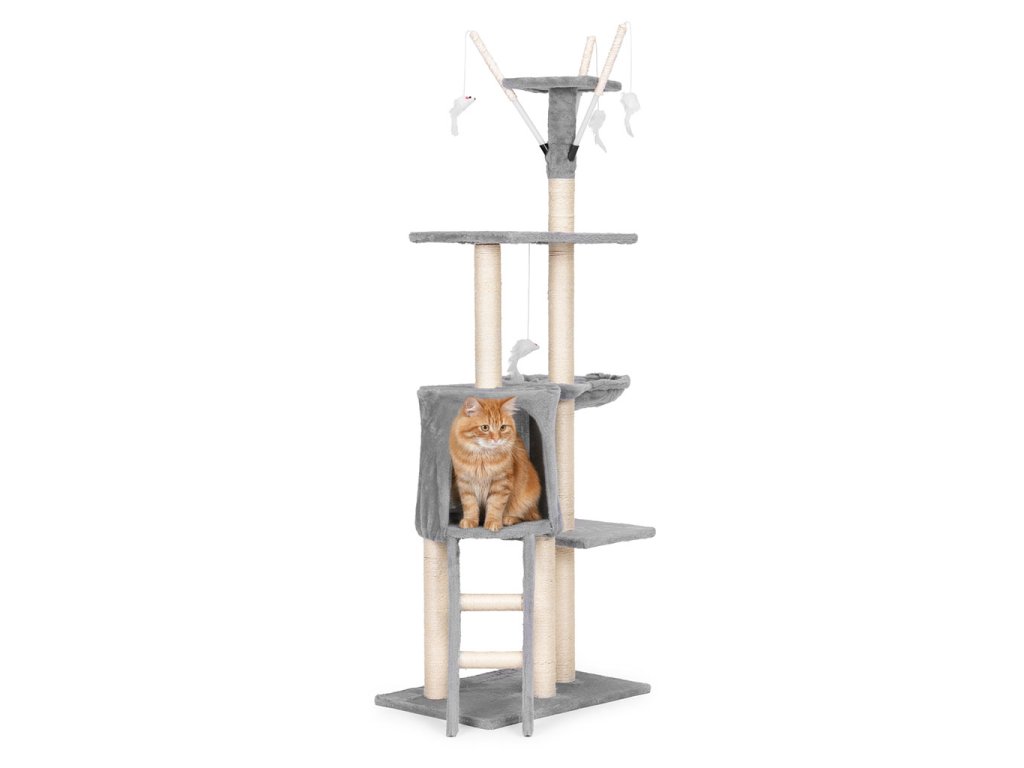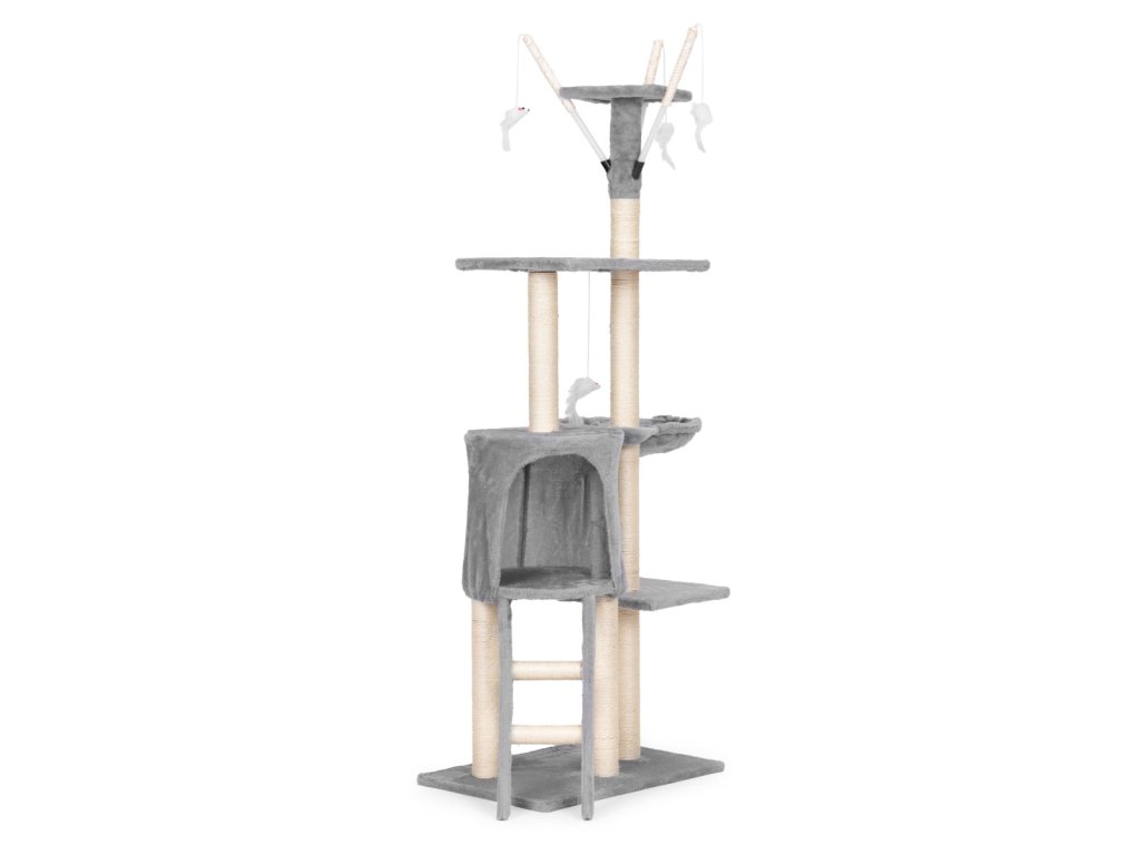 Škrabadlo pro kočku 134 cm s domečkem a hamakem – šedé