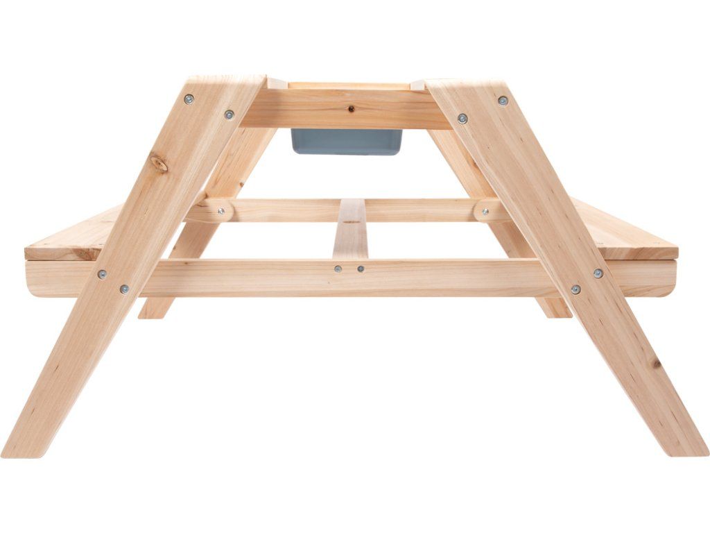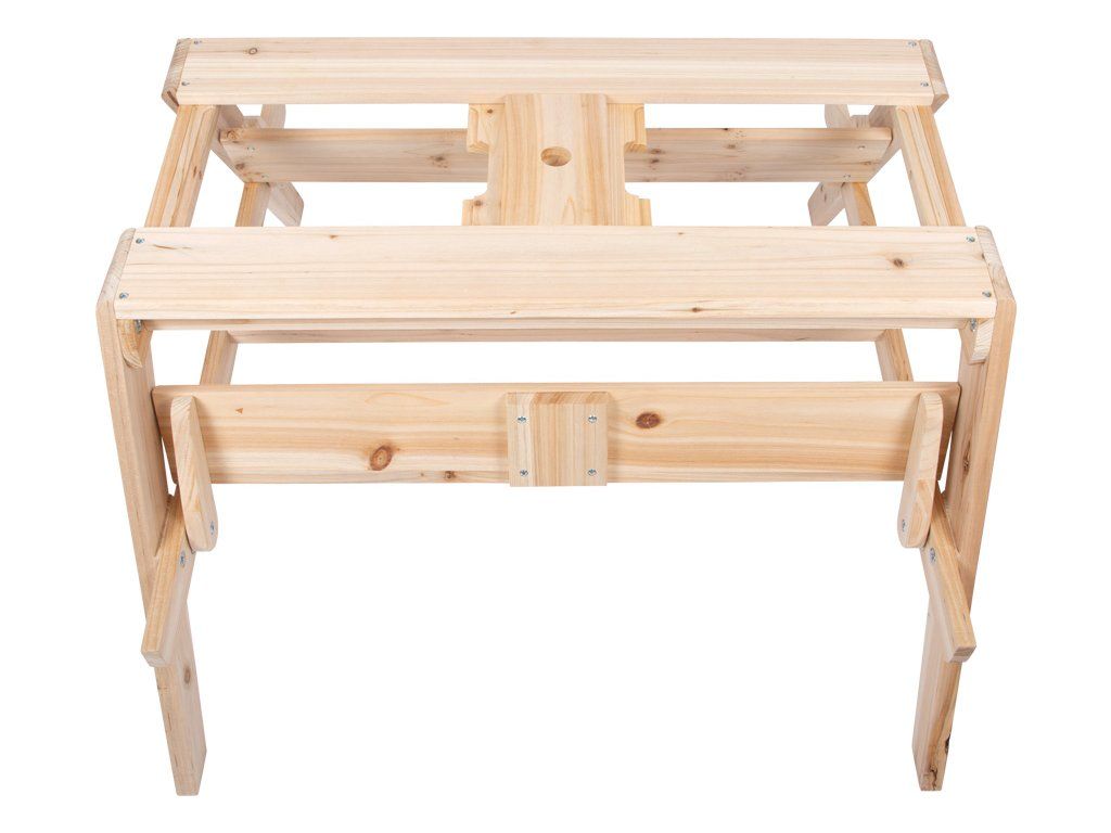 Baví Vás vyrábět bahno a jiné směsi z přírodních materiálů? Tento stůl z masivního dřeva odolného vůči povětrnostním vlivům upoutá nejen pozornost na zahradě, terase nebo balkonu, ale především nabízí dětem možnost dlouhé hodiny kreativní hry na čerstvém vzduchu. Vrchol se skrývá uvnitř dětského stolku. Jakmile se zvednou dvě stolní desky, vznikne úžasné místo na hraní s pískem, vodou nebo blátem. Dvě odnímatelné vaničky z robustního plastu o objemu 3 litry každá, jsou ideální nejen na míchání různých materiálu, ale také pro uskladnění hraček na písek, uskladnění písku, sběr přírodních materiálů nebo naplnění vodou. Lavice se dají sklopit. Chytrá, multifunkční dětská sedací souprava, která kromě funkce posezení může sloužit také jako piknikový stůl, stůl k malování atd. Prohlubně v oblasti plastových van usnadňují vyjímání van a do otvoru uprostřed plochy stolu se dá zasunout slunečník pro stínění. Rozšířené nohy zajišťují bezpečné postavení, stabilitu a vysoce kvalitní dřevo zaručuje dlouhou životnost. To je důležité, protože stůl povzbuzuje děti, aby přicházely s novými, kreativními nápady na hraní a experimentovaly po dlouhou dobu. Co plave na hladině vody, co se potápí? Co se stane s pískem když zmokne? Jaké tvary můžete vytvořit s hračkami do písku? Hra s pískem nabízí řadu smyslových podnětů prostřednictvím povrchového vnímání kůže a podporuje jemnou motoriku. Pro dlouhodobé používání a pro ochranu neošetřovaného dřeva je možné jej ošetřit ochrannou lazurou na dřevo a barevně upravit dle vlastních potřeb. Hlavní vlastnosti: multifunkční posezení 2 v 1 vyrobeno z masivního dřeva2 vyjímatelné multifunkční plastové vaničky (3l)kompaktní posezení na terasy, balkony a zahradynosnost 100 kgDoplňkové parametry