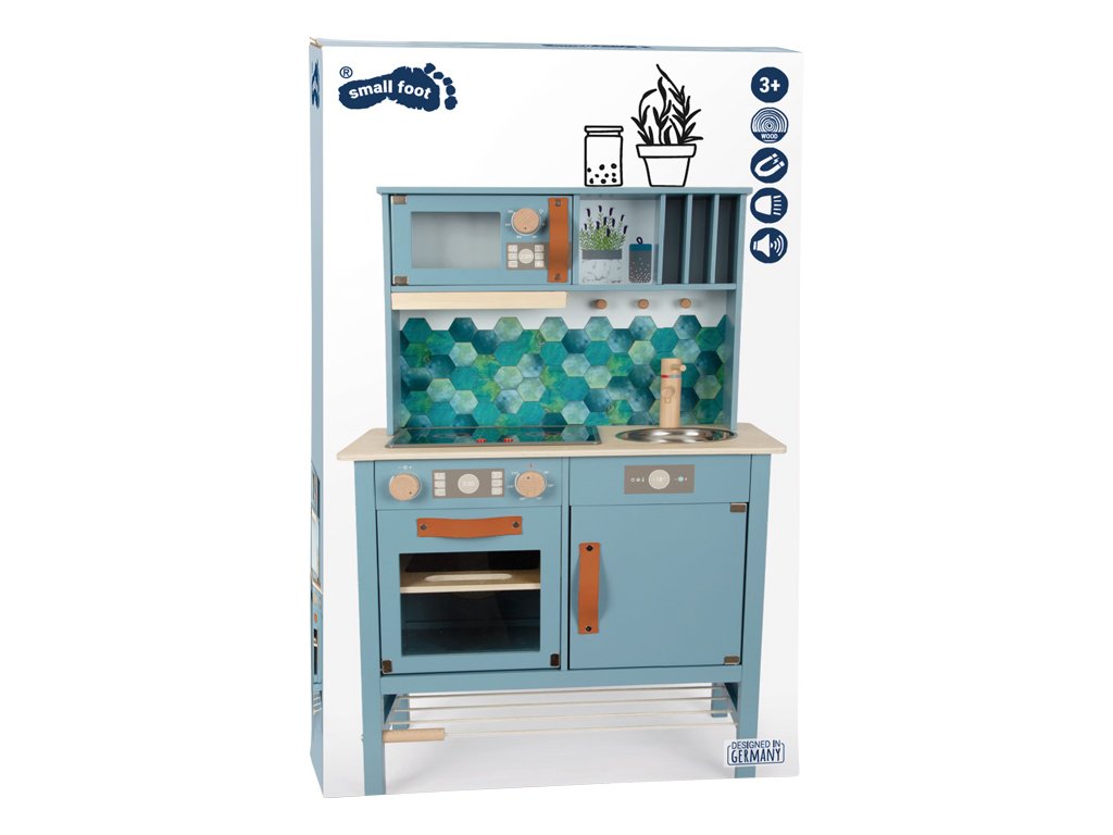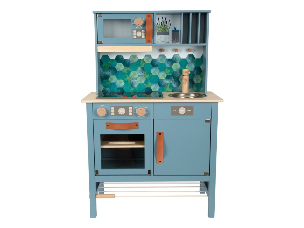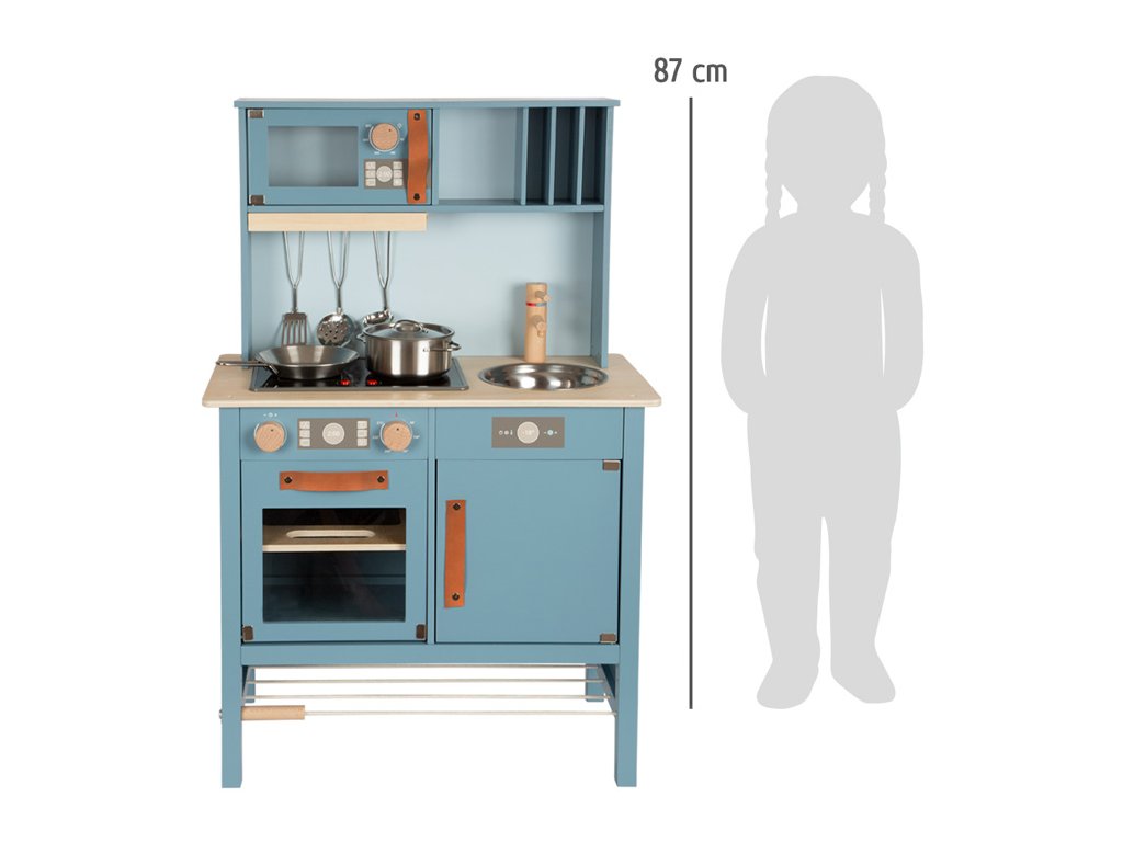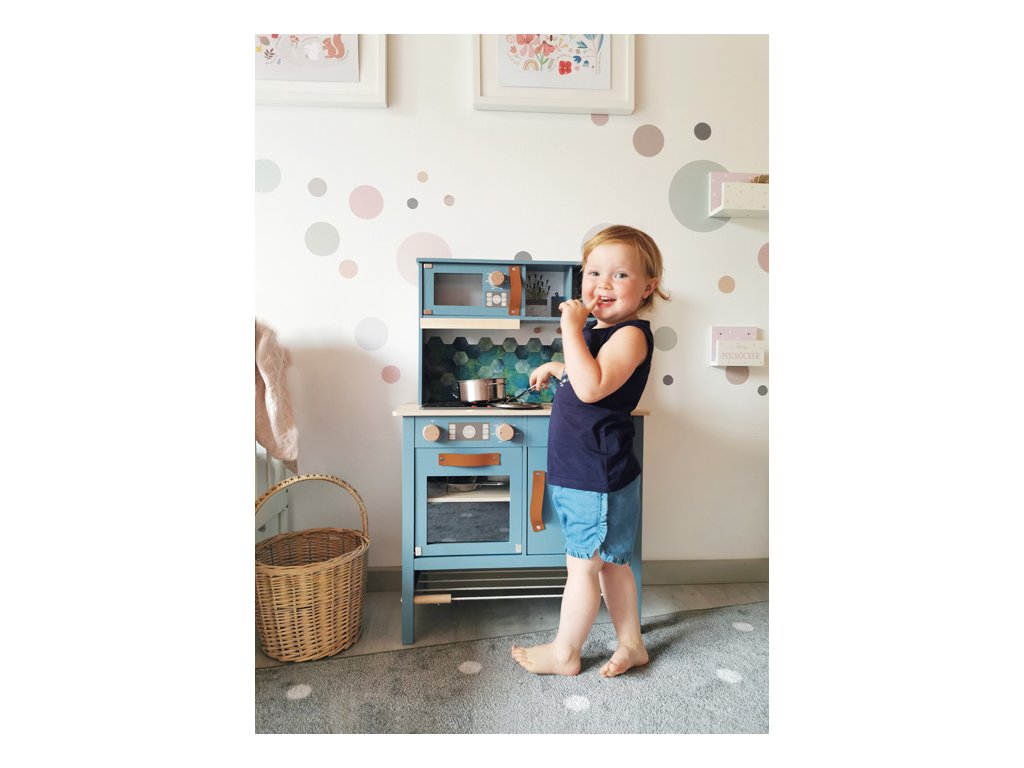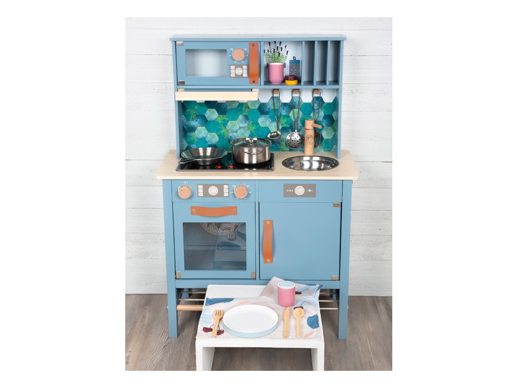 Moderní dětská kuchyňka s robustní konstrukcí v trendy kouřově modré barvě, v kombinaci se stylovými koženými madly v koňakové barvě. Okamžitě připravena k hraní s přiloženým hrncem s poklicí, pánví a kovovým kuchyňským náčiním. Dodává se s kovovým dřezem a otočnými knoflíky, které vydávají zvuk. Součástí je elektronická varná deska se světlem/zvukem a zatahovací digestoří se světelným symbolem. 2v1, vyjímatelný pekáč lze použít také jako tabuli. Povrchy v chladničce a troubě jsou potištěné kuchyňskými detaily pro větší zábavu při hraní. Oboustranný zadní panel s vysoce kvalitním potiskem ve vzhledu dlaždic nebo jednoduché modré barvě. Lze perfektně doplnit dalšími výrobky a kuchyňskými spotřebiči z kolekce Tasty. Hlavní vlastnosti: kovové doplňky a příslušenstvífunční prvky jako cvakající knoflíky, varná deska s efektem světla a zvukunový moderní designnapájení - 2xAA baterie (nejsou součástí balení)možné doplnit produkty z kolekce TastyDoplňkové parametry