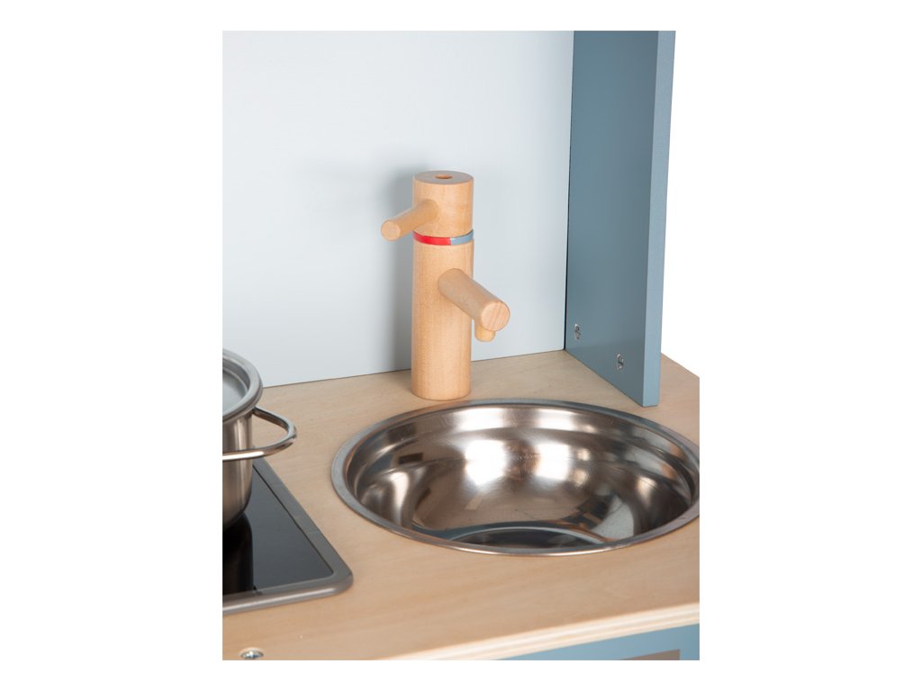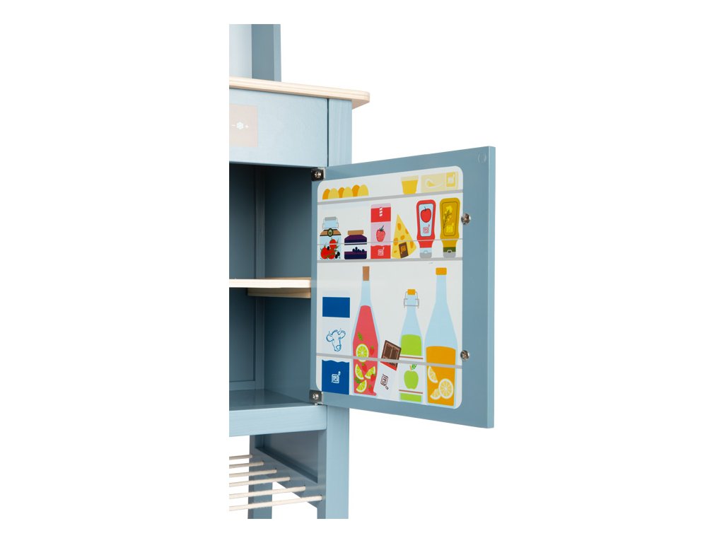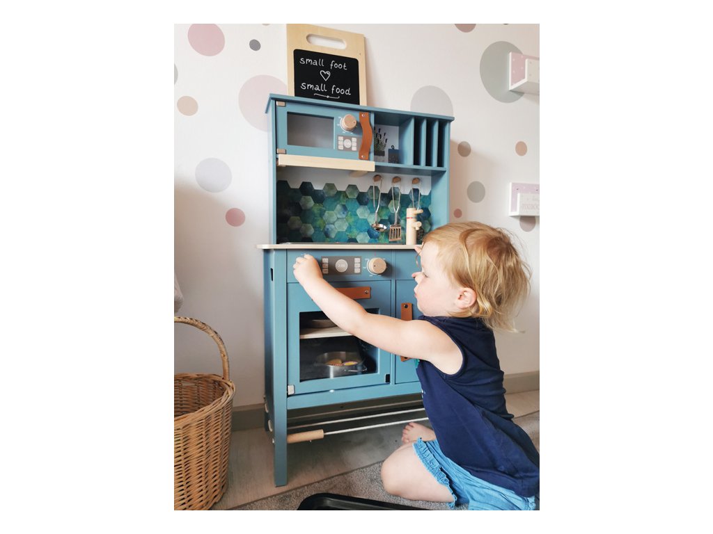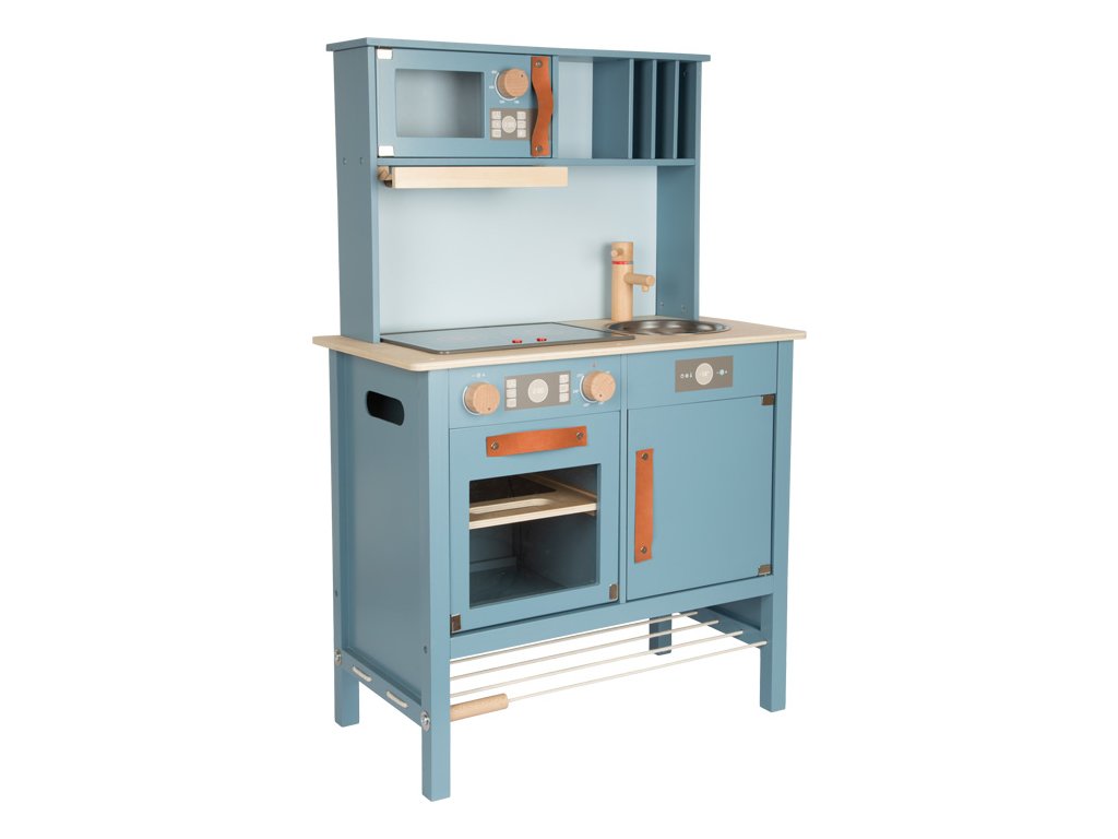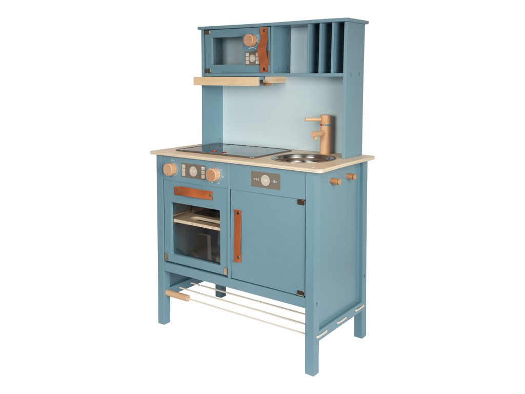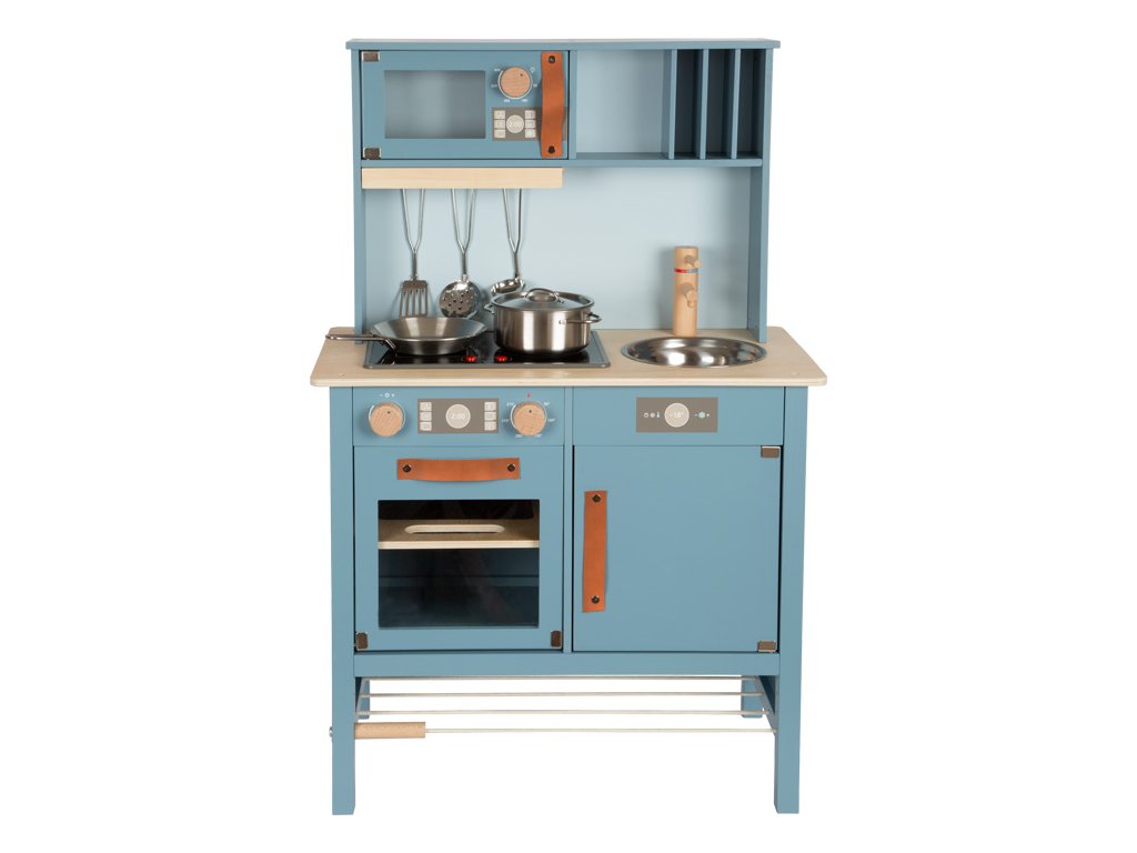 Moderní dětská kuchyňka s robustní konstrukcí v trendy kouřově modré barvě, v kombinaci se stylovými koženými madly v koňakové barvě. Okamžitě připravena k hraní s přiloženým hrncem s poklicí, pánví a kovovým kuchyňským náčiním. Dodává se s kovovým dřezem a otočnými knoflíky, které vydávají zvuk. Součástí je elektronická varná deska se světlem/zvukem a zatahovací digestoří se světelným symbolem. 2v1, vyjímatelný pekáč lze použít také jako tabuli. Povrchy v chladničce a troubě jsou potištěné kuchyňskými detaily pro větší zábavu při hraní. Oboustranný zadní panel s vysoce kvalitním potiskem ve vzhledu dlaždic nebo jednoduché modré barvě. Lze perfektně doplnit dalšími výrobky a kuchyňskými spotřebiči z kolekce Tasty. Hlavní vlastnosti: kovové doplňky a příslušenstvífunční prvky jako cvakající knoflíky, varná deska s efektem světla a zvukunový moderní designnapájení - 2xAA baterie (nejsou součástí balení)možné doplnit produkty z kolekce TastyDoplňkové parametry