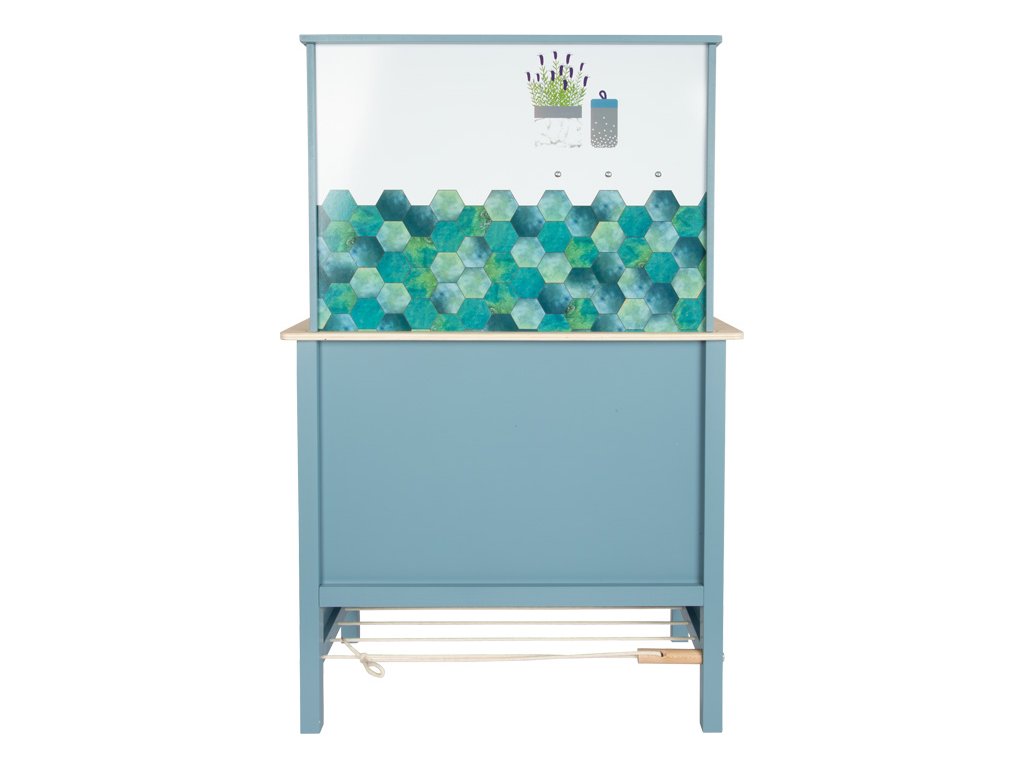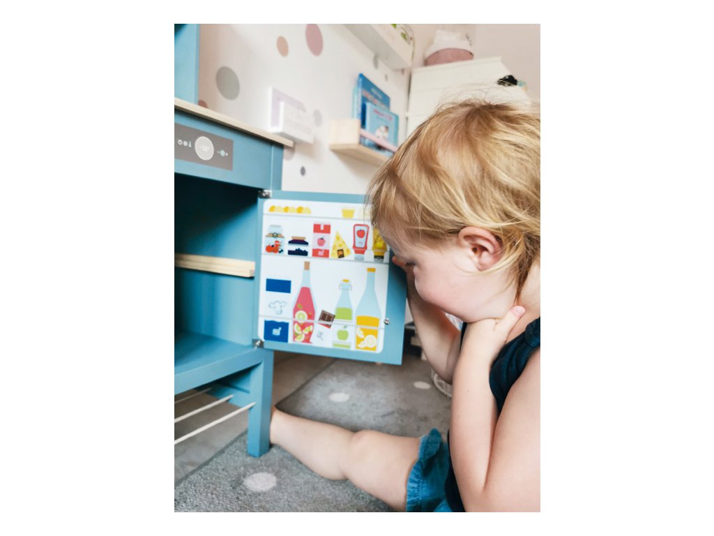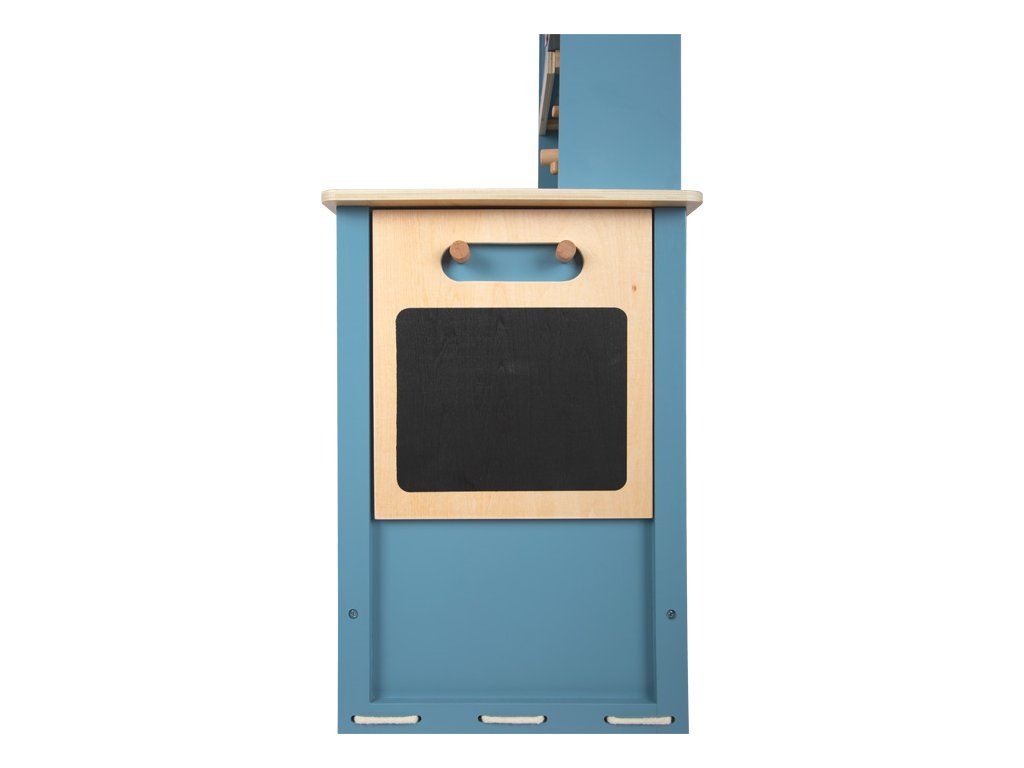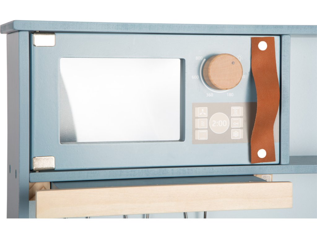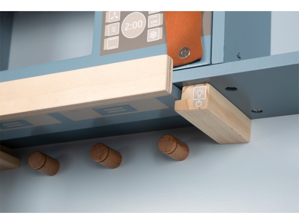 Moderní dětská kuchyňka s robustní konstrukcí v trendy kouřově modré barvě, v kombinaci se stylovými koženými madly v koňakové barvě. Okamžitě připravena k hraní s přiloženým hrncem s poklicí, pánví a kovovým kuchyňským náčiním. Dodává se s kovovým dřezem a otočnými knoflíky, které vydávají zvuk. Součástí je elektronická varná deska se světlem/zvukem a zatahovací digestoří se světelným symbolem. 2v1, vyjímatelný pekáč lze použít také jako tabuli. Povrchy v chladničce a troubě jsou potištěné kuchyňskými detaily pro větší zábavu při hraní. Oboustranný zadní panel s vysoce kvalitním potiskem ve vzhledu dlaždic nebo jednoduché modré barvě. Lze perfektně doplnit dalšími výrobky a kuchyňskými spotřebiči z kolekce Tasty. Hlavní vlastnosti: kovové doplňky a příslušenstvífunční prvky jako cvakající knoflíky, varná deska s efektem světla a zvukunový moderní designnapájení - 2xAA baterie (nejsou součástí balení)možné doplnit produkty z kolekce TastyDoplňkové parametry