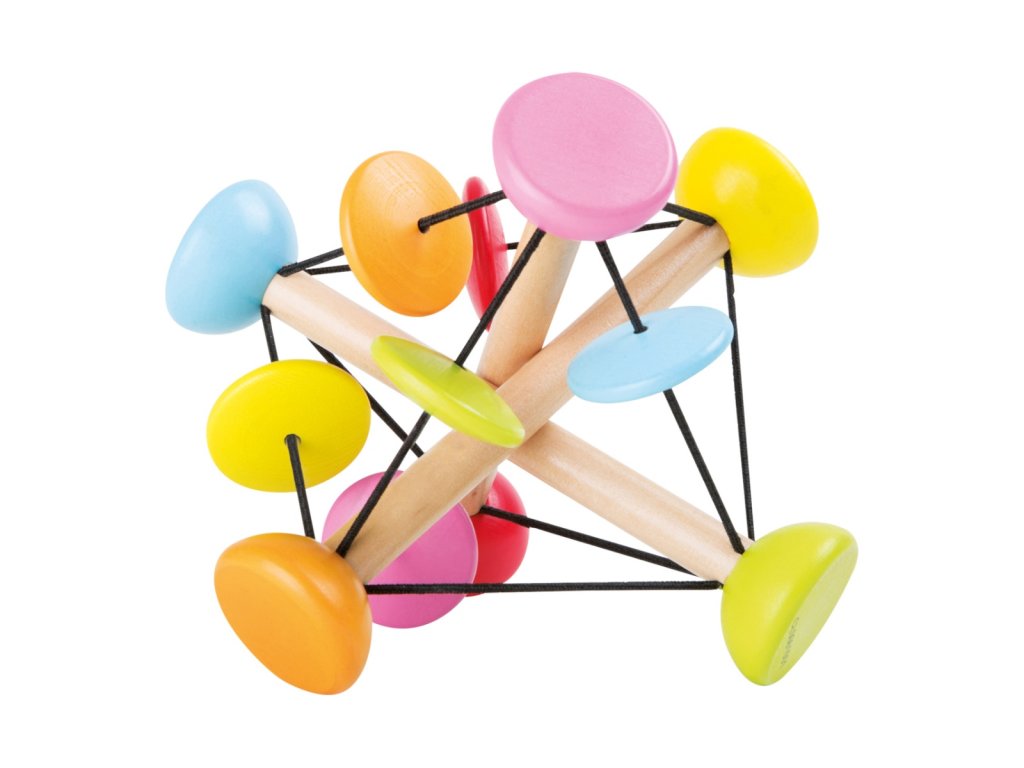 Tři dřevěné tyčky jsou spojeny gumičkami. Jsou vysoce flexibilní a lze je libovolně otáčet. Je to skutečná sportovní výzva pro malé ručičky. Barevné posuvné prvky při pohybu chrastí. Hlavní vlastnosti: barevný designvyrobeno v Německu z kvalitních a zodpovědně získaných materiálůDoplňkové parametry
