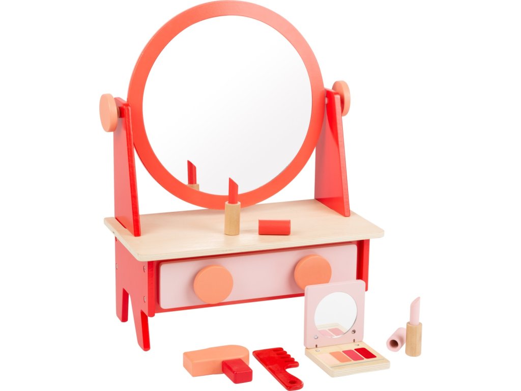 Kosmetický salon je otevřený! Mladé parádnice se mohou upravit podle svých představ a poté svůj vzhled zkontrolovat ve sklopném zrcadle. Tuto sadu doplňují dřevěné potřeby pro líčení a péči o vlasy – dvě rtěnky, malé oční stíny se zrcátkem, hřeben a fén. Pomůcky lze je uschovat do zásuvky prakticky rozdělené na tři části. Díky své kompaktní velikosti se tento make-up stolek vejde do každého dětského pokoje či školky. Hlavní vlastnosti: obsahuje 9 dílůretro designstabilní dřevěné provedeníDoplňkové parametry