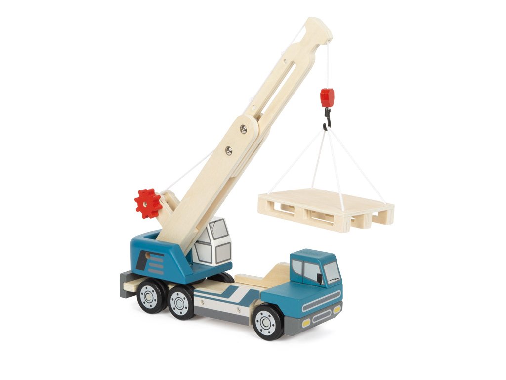 Perfektní dopravní prostředek pro mladé stavební dělníky! Zvedání a přemísťování břemen v dětském pokoji? Ano, je to možné! Umístěte náklad na paletku nebo přímo na jeřáb a přepravte ho z bodu A do bodu B. Paleta je součástí balení. Stroj vhodný pro malé stavební dělníky. Díky zaobleným hranám a okenním otvorům jej mohou malé dětské ručičky snadno uchopit a pohybovat s ním. Pogumované pneumatiky navíc zajišťují tichý pohyb. Tento nákladní jeřáb nesmí chybět v žádném vozovém parku! Hlavní vlastnosti: otáčení jeřábu o 360 stupňůrozvíjí jemnou motorikupodporuje koordinaci ruka-okomalá dřevěná paleta součástí balenímechanická tažná kladka s háčkempogumovaná kolaDoplňkové parametry