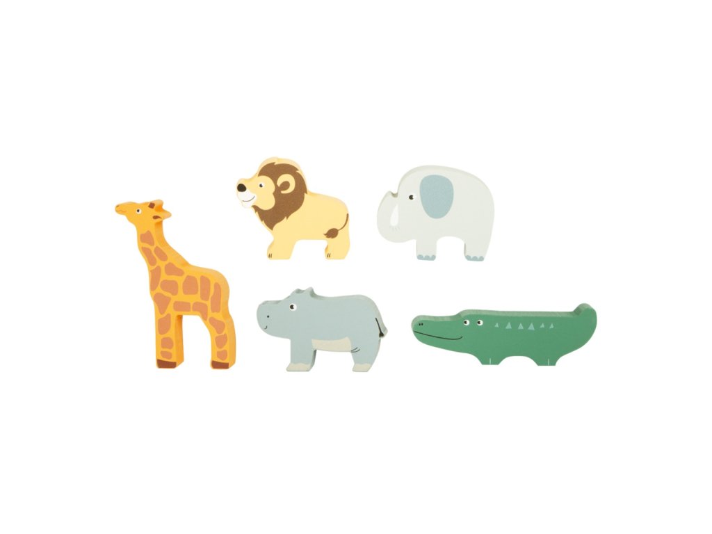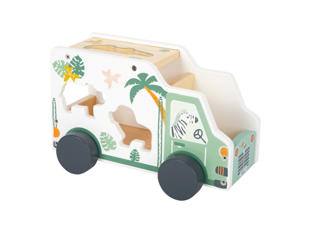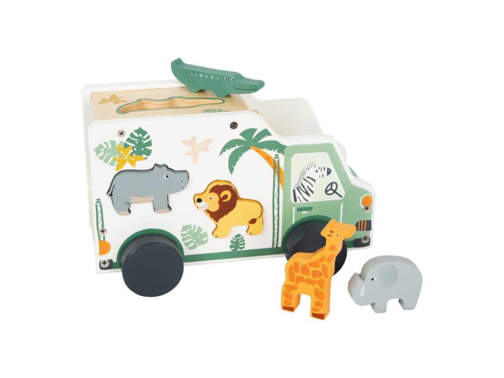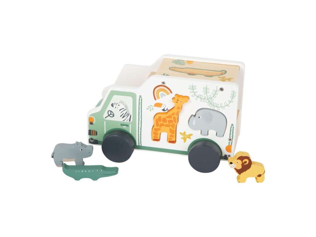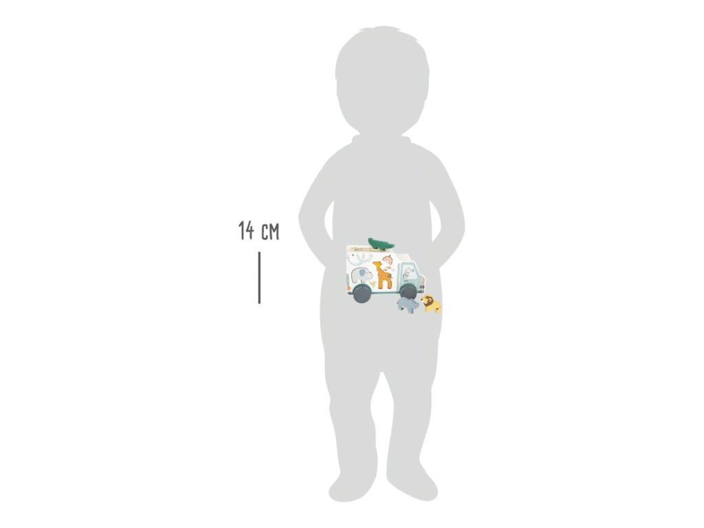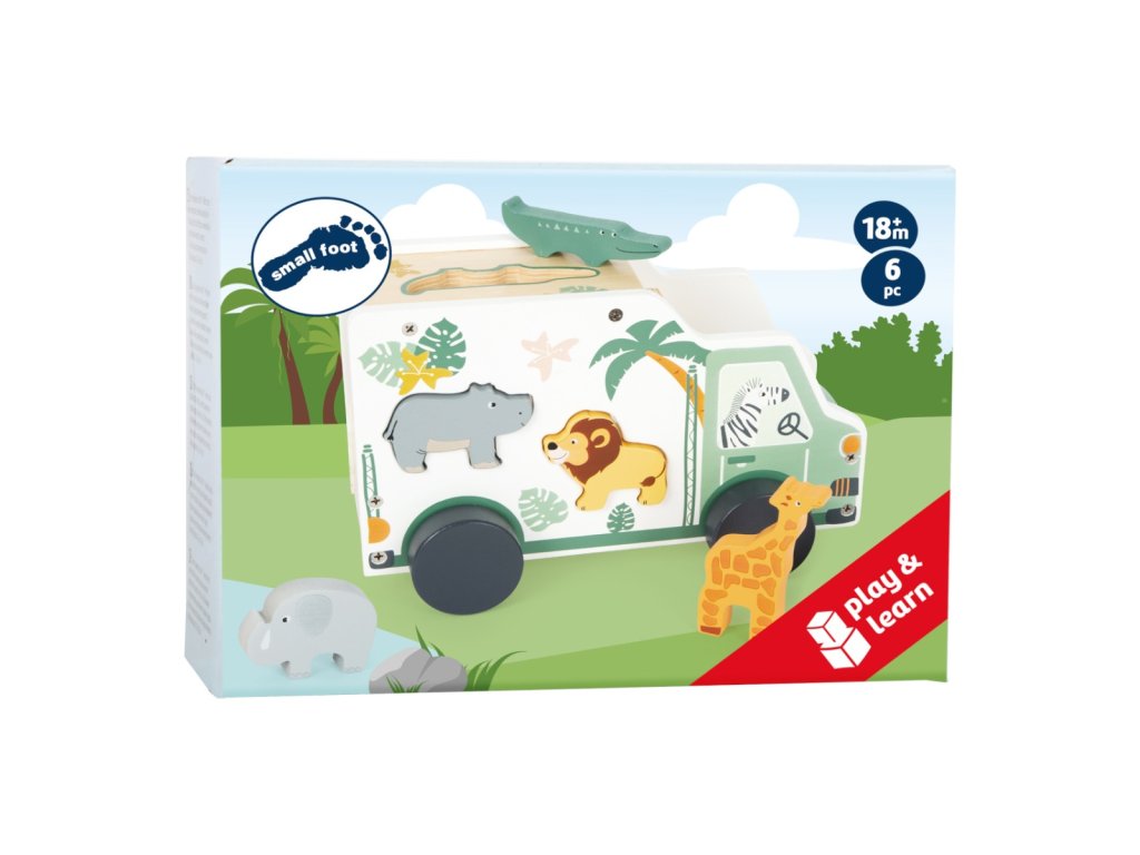 Vkládací hračka a dřevěné autíčko v jednom. Dřevěná vkládačka v populárním safari designu. Žirafa, hroch, lev a jejich kamarádi jsou připraveni na výlet do divočiny se zebrou řidičkou. Safari minibus má pět vkládacích otvorů, pro každé zvíře jeden. Krásná hračka, která trénuje rozpoznávání tvarů a motoriku. Auto má mnoho detailů a dost místa pro roztomilé figurky. Dlouhotrvající zábava v každém dětském pokojíku! Hlavní vlastnosti: ilustrováno, pastelové barvyauto a 5 dílůDoplňkové parametry