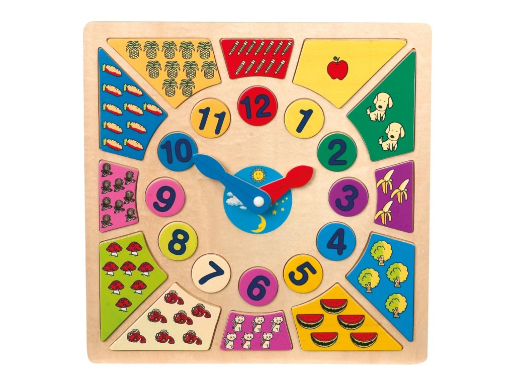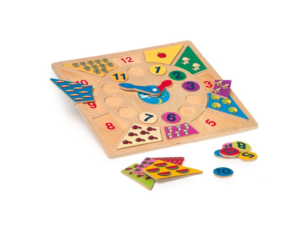 Půl deváté? Za deset deset? S touto barevnou hračkou se děti jednoduše naučí poznávat čas a užijí si při tom spoustu zábavy. Dřevěné dílky s číslicemi můžete z hrací desky vyjmout a poté opět vložit zpět, ale se správně seřazenými časy a množstvím. Skvělá hračka pro předškolní i školní děti, která jim pomůže s učením čísel. Bude se hodit do každého dětského pokoje. Hlavní vlastnosti: dřevěná vkládací výuková hračkanaučí děti poznávat čas i množstvítrénuje zručnostDoplňkové parametry