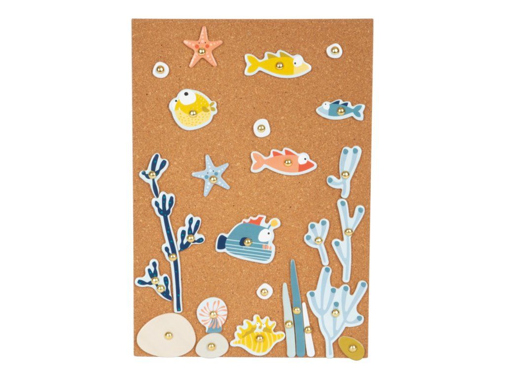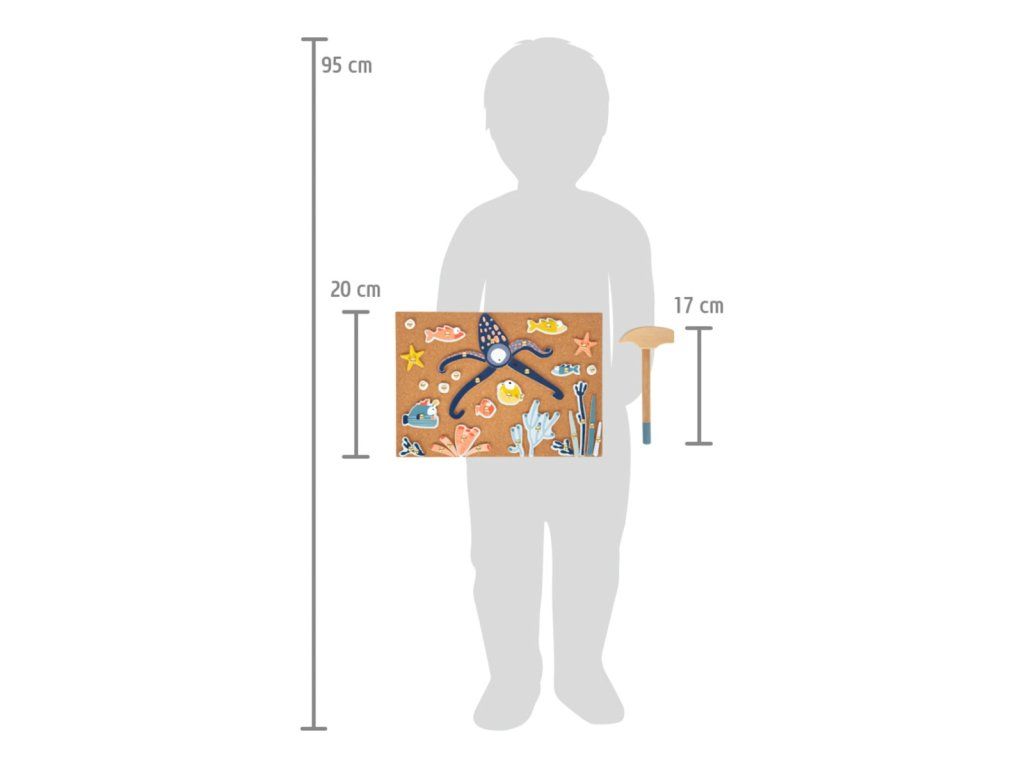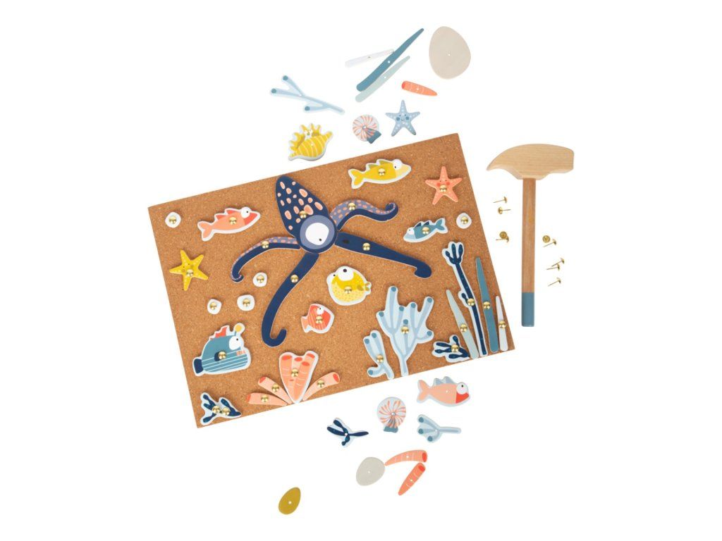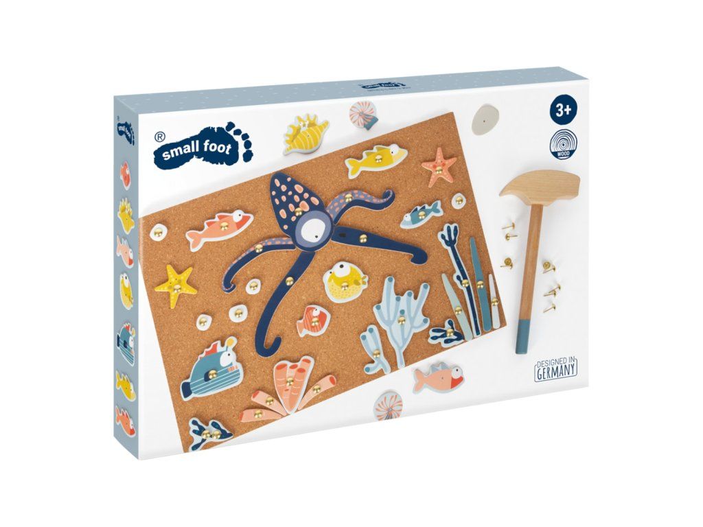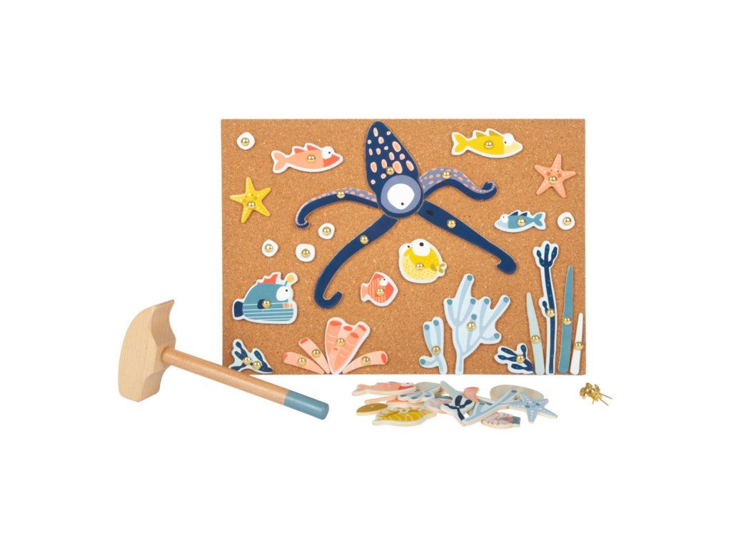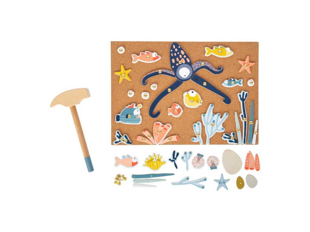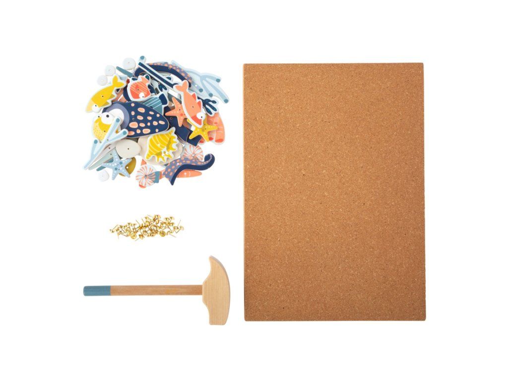 Hra pro všechny, kdo se nebojí sestoupit pod hladinu. Tvořte pomocí kladívka a hřebíčků rozmanité scény života v mořích. Dílky různých tvarů a sytých barev upoutají pozornost a podnítí fantazii dětí. Jejich upevňováním na korkovou desku pomocí kladívka mohou děti rozvíjet svou zručnost, jemnou motoriku i koordinaci rukou a zraku. Pro opakované použití a delší životnost jsou dílky opatřeny vrstvou odolného laminátu. Hřebíčky jsou přizpůsobeny neobratným dětským ručkám a opatřeny velkými hlavičkami, aby bylo snadné je trefit kladívkem, nebo scénu rozebrat. Hlavní vlastnosti:deska, dílky s potiskem, kladívko a hřebíčkyodolné provedeníDoplňkové parametry