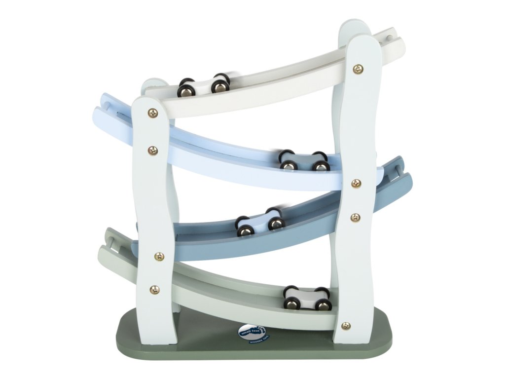 Na značky, připravit, start! Tato dřevěná kaskádová závodní dráha nabízí prostor pro změření rychlosti 4 autíček. Z jednoho patra na druhé, autíčka dělají přemety a jen koukat na ně je zábavné. Dráha je vyrobena z přírodního a bílého dřeva, jedno autíčko je přírodní, zbylé 3 jsou barevné. Hračka rozvíjí motoriku dětí, také koordinaci ruka-oko. Hlavní vlastnosti Klasický design v modrošedé barvěOboustranná autíčka s pogumovanými kolyRozvíjí motoriku a koordinaci ruka-okoDoplňkové parametry