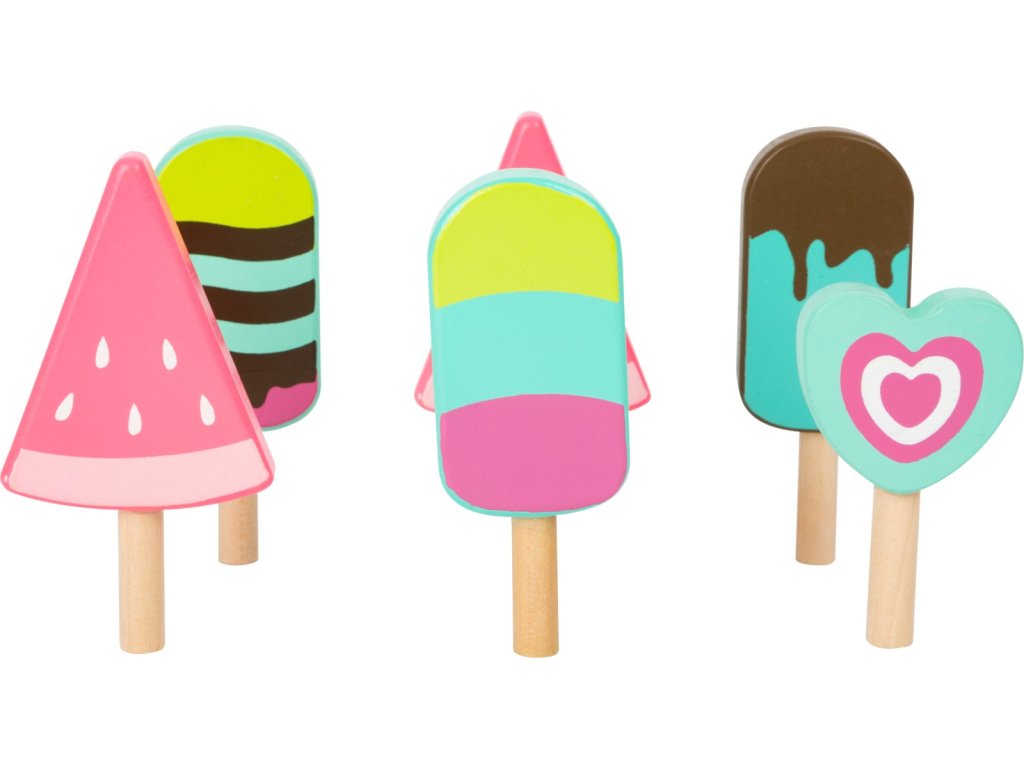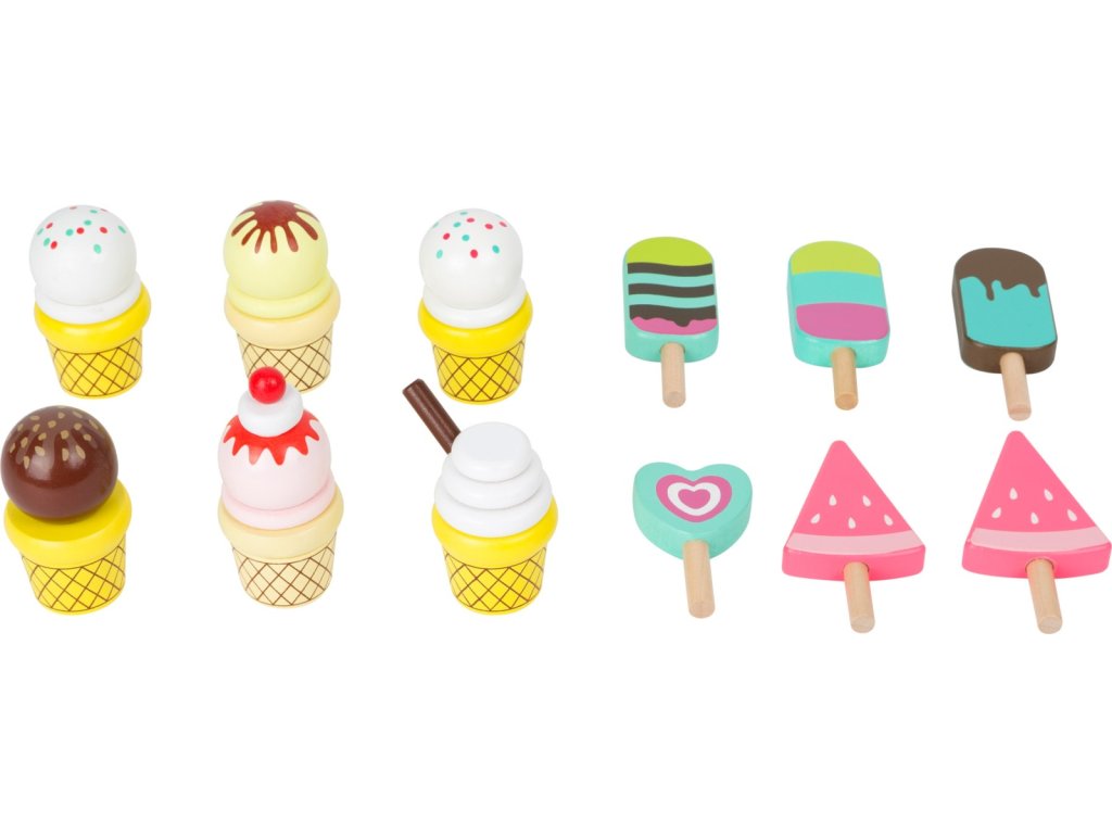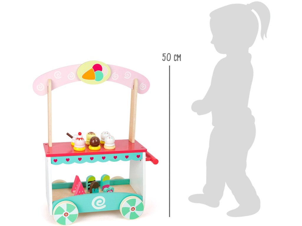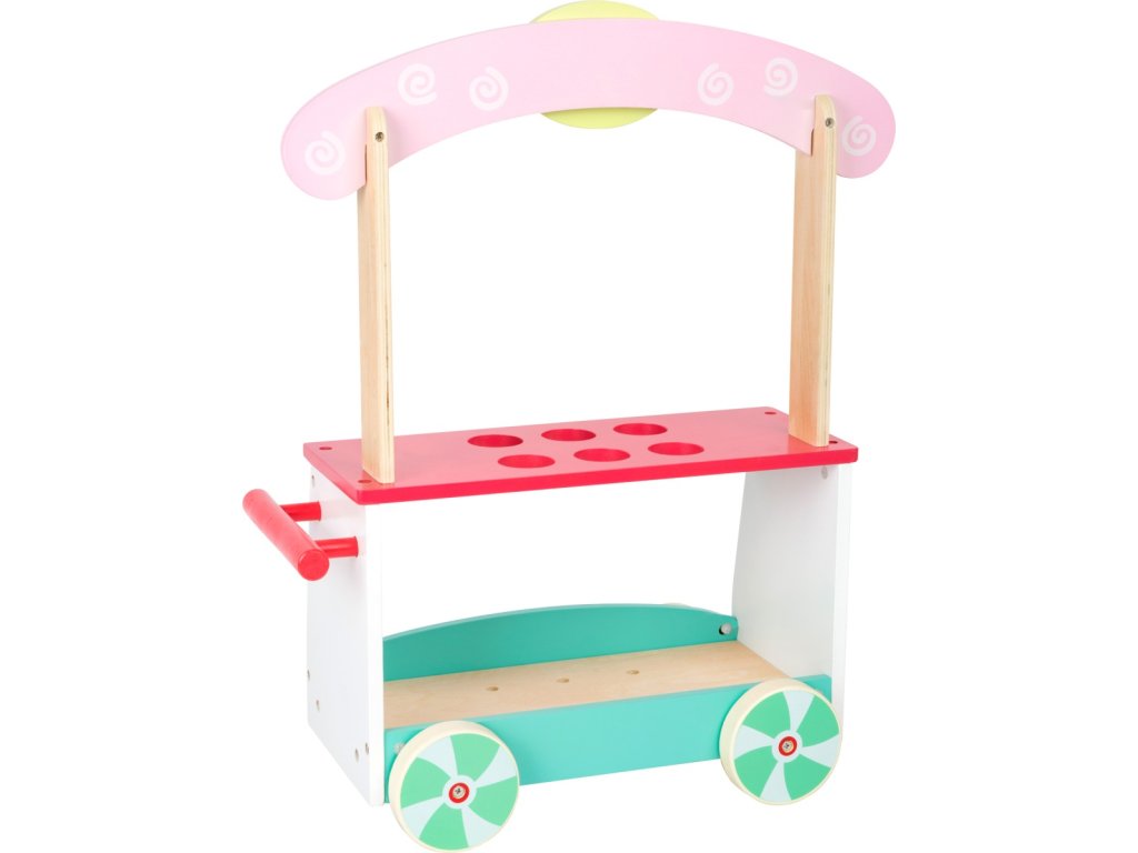 Pojízdný dřevěný zmrzlinový vozík je tady! Díky čtyřem kolečkům a madlu jej lze pohodlně tlačit k dalšímu zákazníkovi. Nabízíme 6 druhů zmrzlin ve vaflovém kornoutu a 6 nanuků na dřevěné tyčince! Kornoutky jsou opatřeny kolíkem, na který kopečky nasazujeme a vzájemně je kombinujeme. Vozík je využitelný i jako stánek na trhu. Hlavní vlastnosti: 12 druhů zmrzlin má ve stánku vyhrazené své místolze použít pro prodej jiných výrobků či rozšířit sortimentspodní police nabízí prostor pro uložení dalších hračekpodporuje kreativní hraní rolí a rozvíjí sociální dovednostiDoplňkové parametry