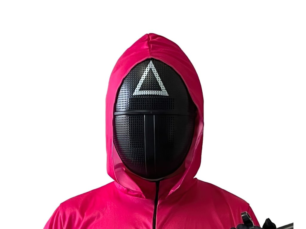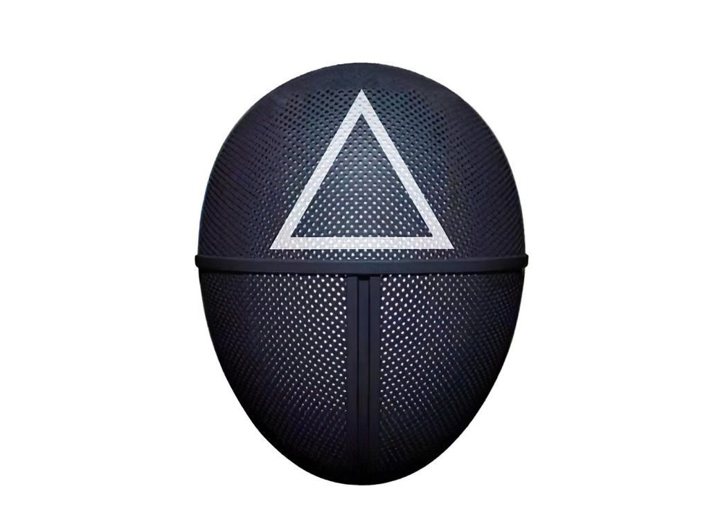 Maska strážce ze seriálu Squid Game je autentickou replikou ikonického doplňku postav, které dohlížejí na soutěž. Černý perforovaný povrch masky umožňuje nositeli snadno vidět, zatímco bílý trojúhelník na čele odkazuje na jednu z hierarchických úrovní mezi strážci. Tento tajemný design okamžitě evokuje napětí a atmosféru oblíbeného seriálu.
