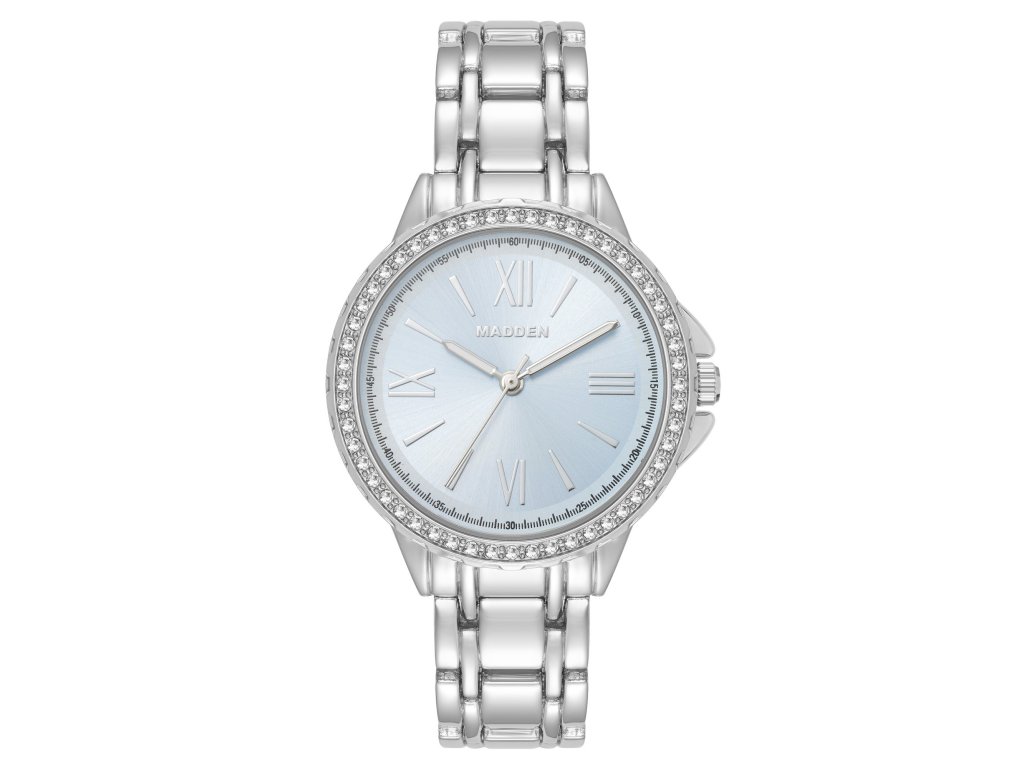 Dámské hodinky Steve Madden v sobě spojují moderní lesk, ženskou eleganci a hravý design. Kombinace stříbrné barvy, jemně světle modrého číselníku a třpytivých krystalů na pouzdře působí jako sofistikovaný šperk, který dodá každému outfitu lehkost a styl.