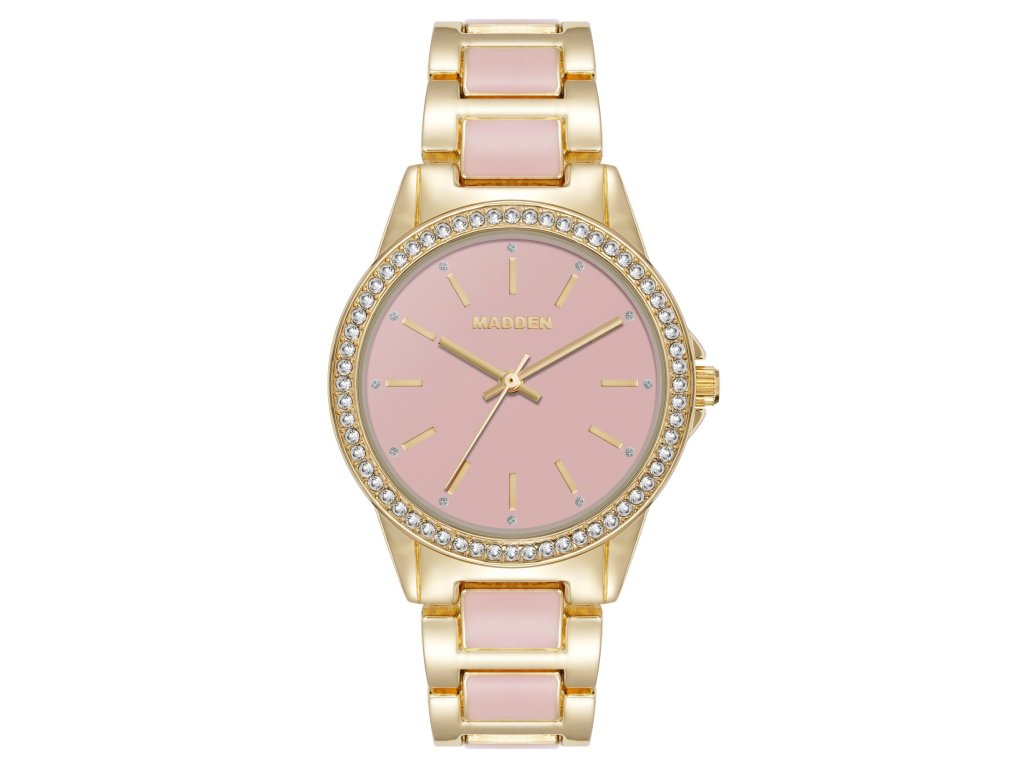 Dámské hodinky od značky Steve Madden v sobě spojují jemnou ženskost, moderní lesk a výrazný módní styl. Kombinace zlato-růžových tónů, třpytivých krystalů a sladěného růžového číselníku vytváří doplněk, který na zápěstí působí jako půvabný a zářivý šperk.