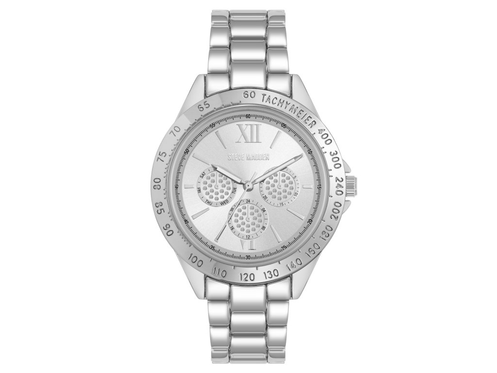 Dámské hodinky od značky Steve Madden v sobě spojují minimalistickou eleganci, moderní lesk a nadčasový styl. Jednotné stříbrné provedení působí čistě a univerzálně, takže hodinky snadno doplní jakýkoliv outfit – od ležérního po elegantní.
