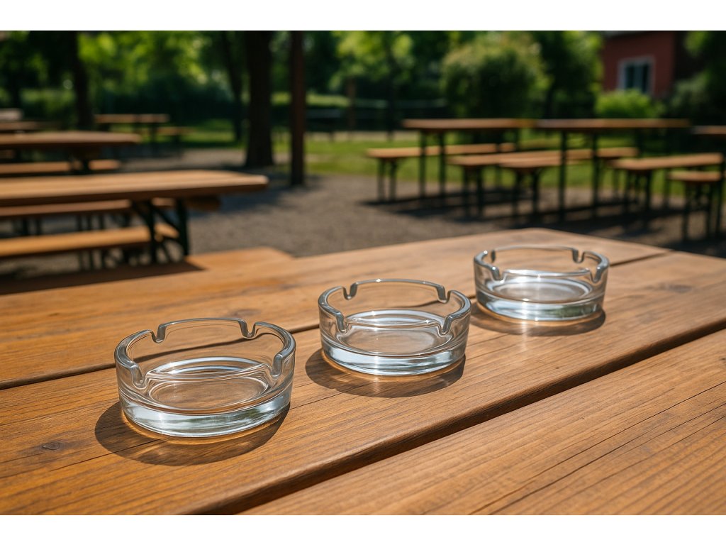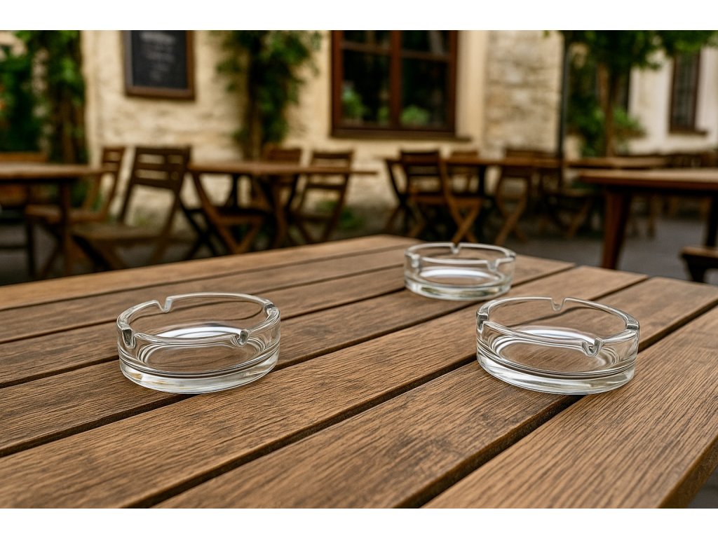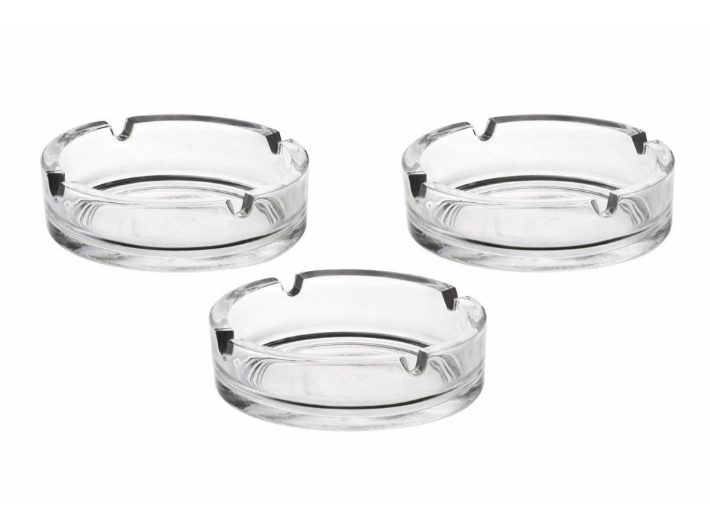 Klasický skleněný stolní popelník se čtyřmi zářezy na cigarety se hodí do domácností, ale i do restaurací a ostatních provozů. Průměr 10 cm, výška 3 cm. Sada obsahuje 3 ks