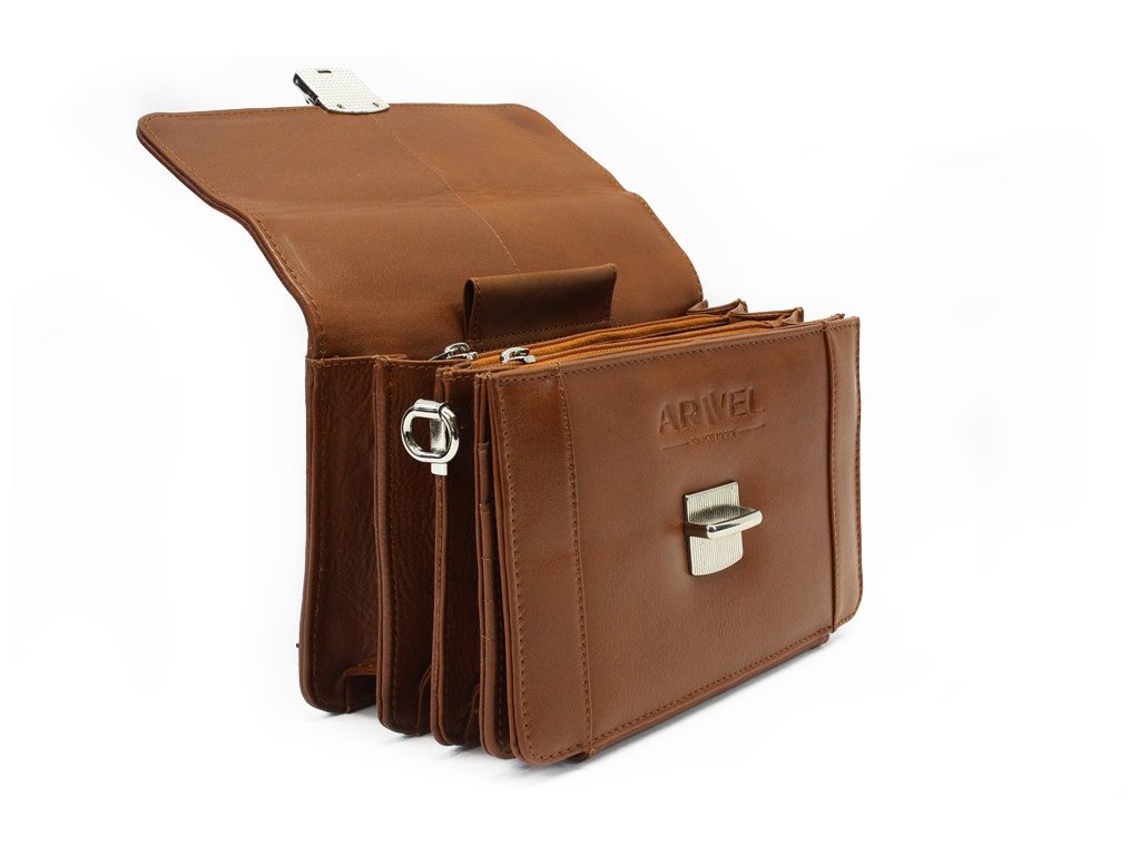 3 separace oddělené zipovými kapsami, sklápěcí registr s 2 kapsami na doklady, 4 kapsy pro platební karty či vizitky, 2 zipové kapsy, odepínatelný kroužek na klíče, odepínací poutko na zápěstí, odepínací popruh přes rameno nastavitelný do cca 130 cm.