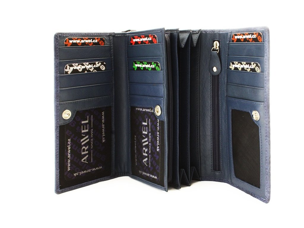 Atraktivní dámská velká peněženka obsahuje 2 přihrádky na bankovky, vnitřní rozdělenou zipovou kapsu na mince, 12 kapes na platební karty či doklady, 5 otevřených kapes a 3 průhledné okna. Na zadní vnější straně je zipová kapsa. Peněženka má zapínání na klopnu s ozdobným kováním jištěnou drukem. Šití je v barvě kůže.