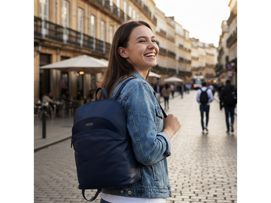 Batoh z pravé hovězí kůže v elegantní tmavě modré barvě nabízí praktické a přehledné uspořádání.