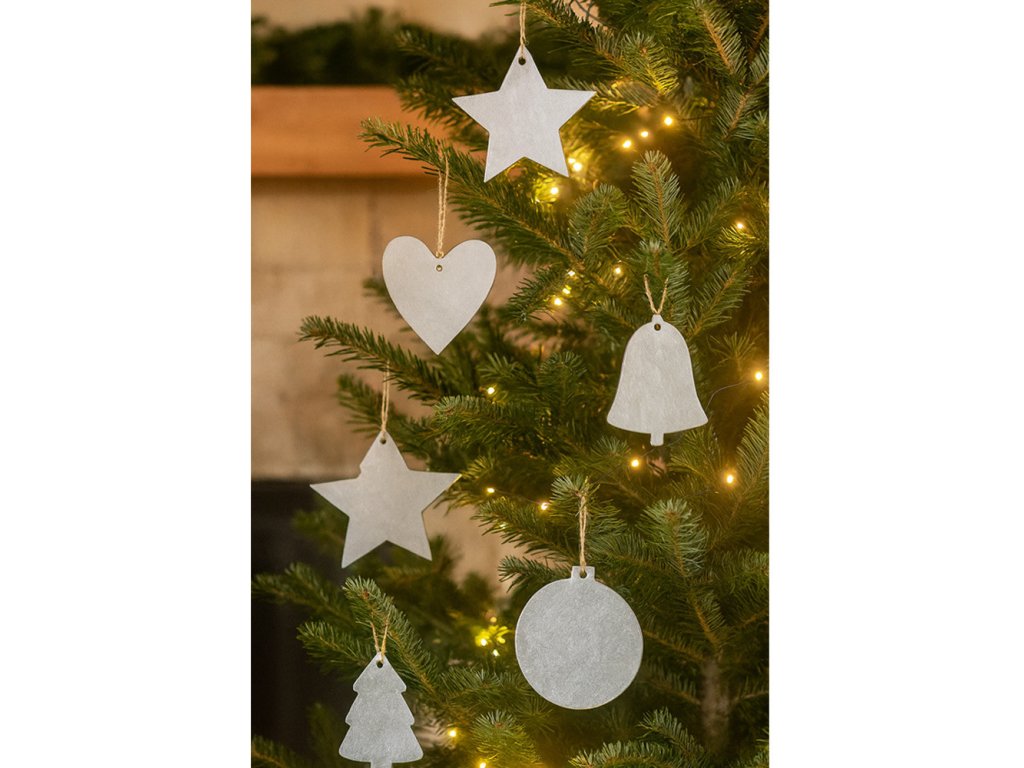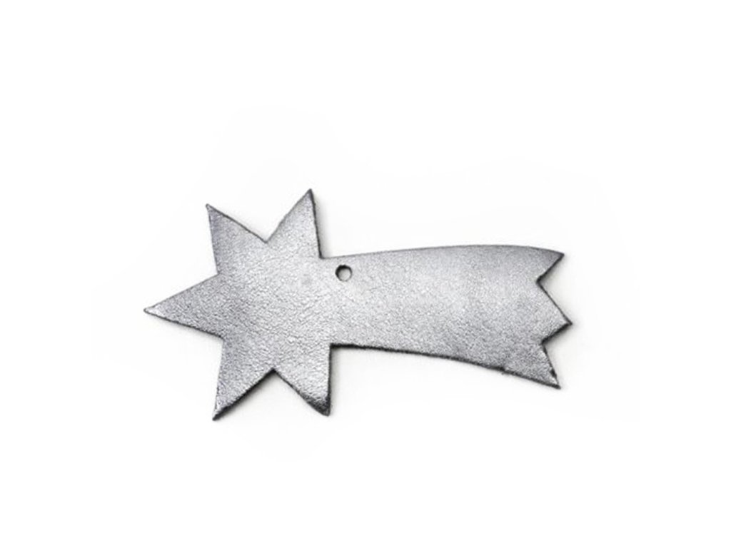 Vánoční sada kožených ozdob na stromeček obsahuje hvězdu, kometu, zvonek, srdce, stromeček a baňku.