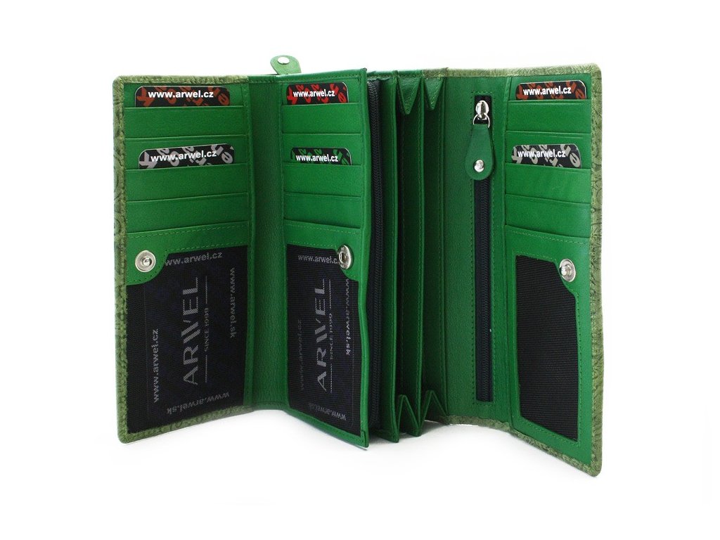 Atraktivní dámská velká peněženka obsahuje 2 přihrádky na bankovky, vnitřní rozdělenou zipovou kapsu na mince, 12 kapes na platební karty či doklady, 5 otevřených kapes a 3 průhledné okna. Na zadní vnější straně je zipová kapsa. Peněženka má zapínání na klopnu s ozdobným kováním jištěnou drukem. Šití je v barvě kůže.