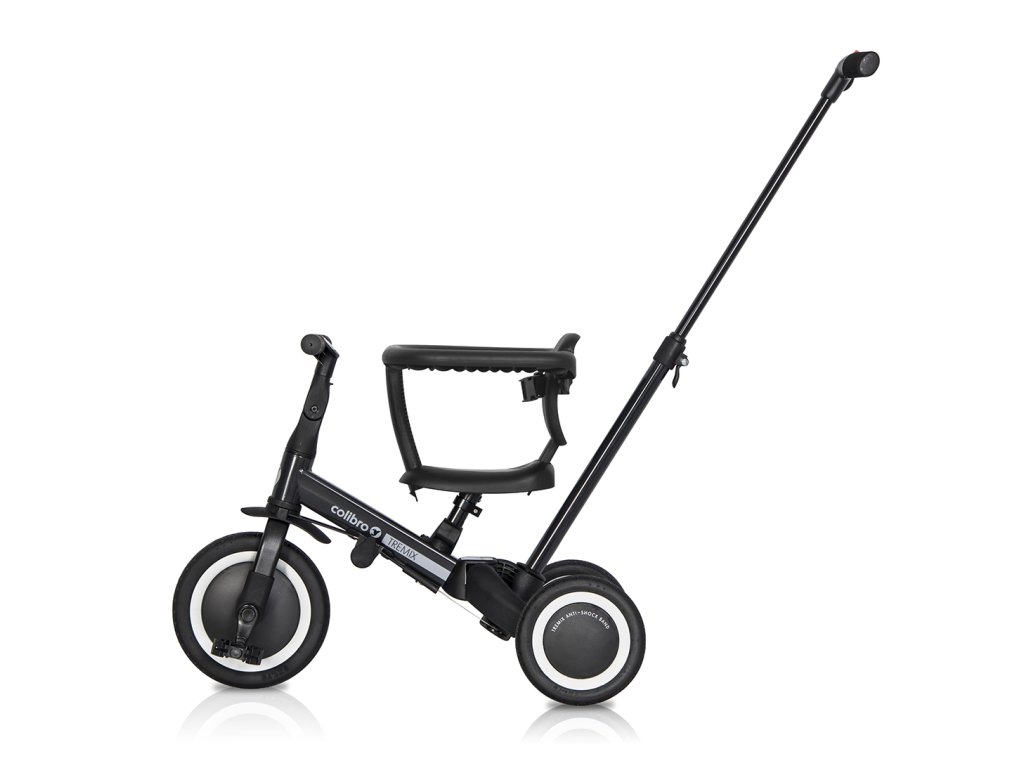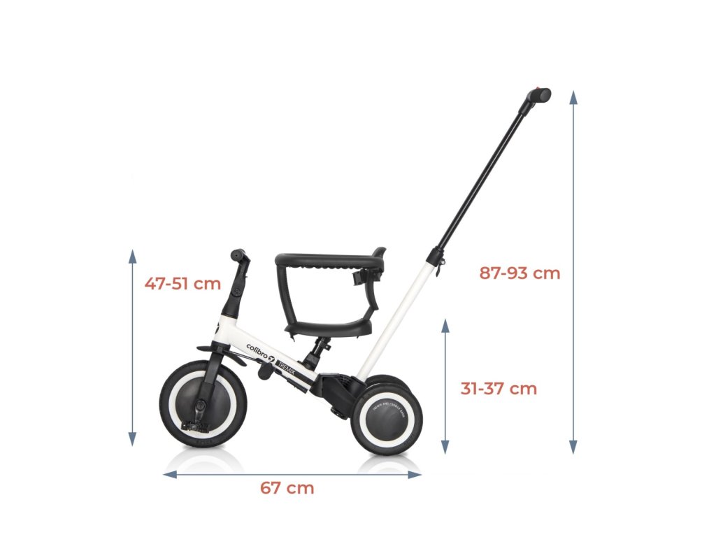 Luxusní Tříkolka Colibro Tremix Up 6v1. Jedno kolo – mnoho možností! TremixUp je multifunkční kolo, které díky svému designu umožňuje měnit konfiguraci. Četné konfigurace kol vám umožní vytvořit dokonalý typ, které vyhovuje potřebám rodičů a dětí. Jakou variantu zvolíte, záleží pouze na potřebách rodiče a dítěte. Díky tomu kolo roste s dítětem a poskytuje mu vybavení, které usnadňuje naučit se jezdit na různých typech kol. Objevte jeho 6 nejběžnějších konfigurací: - Režim tlačení - sportovní kočárek - tříkolka s opěrkou na nožičky a rodičovskými řídítky . Režim pro děti ve věku 1 - 2 let. - Režim odrážedla - tříkolka/odrážedlo bez pedálů na třech kolech. Pro děti ve věku 1 - 2 let. - Tříkolkový režim - tříkolka se třemi koly a pedály. Pro děti ve věku 2 - 3 let. - Režim balančního kola - dvoukolové kolo bez pedálů - Režim dvoukolového kola s pedály a vodící tyčí pro rodiče. - Režim dvoukolového kola s pedály. ROZMĚRY: - DÉLKA : tříkolka 67 cm. - ŠÍŘKA : rozchod zadních kol: 46 cm. - VÝŠKA : od sedadla k zemi: 31-37 cm. - HMOTNOSTI : 5,8 kg kolo s tyčí - 6,9 kg kolo v krabici. - Gumová kola.Doplňkové parametry