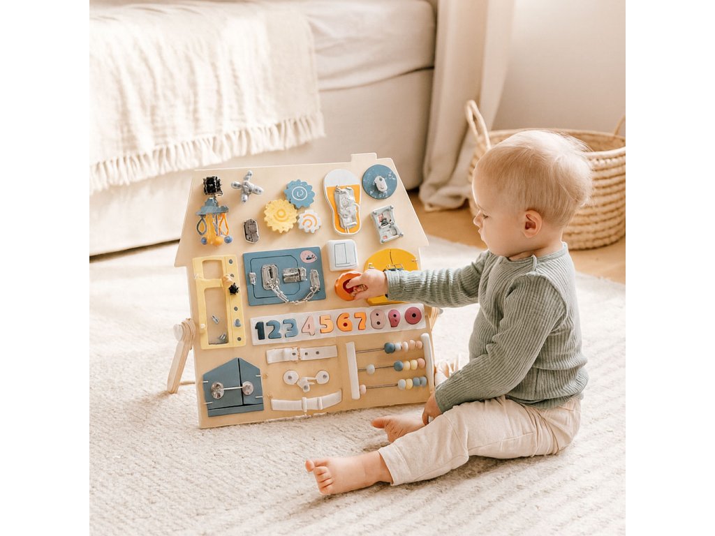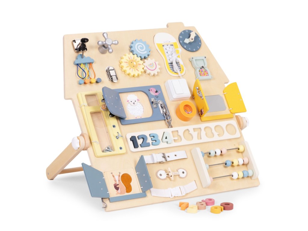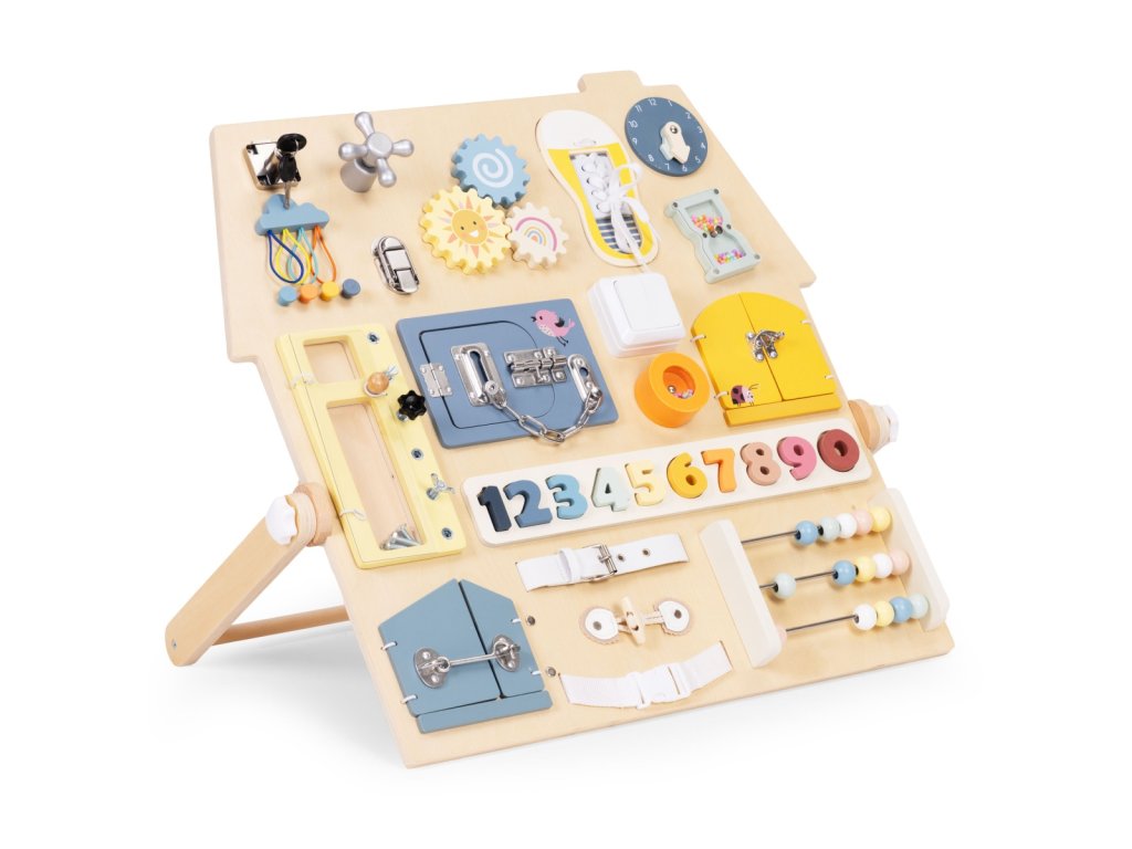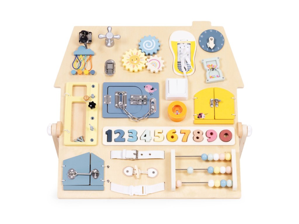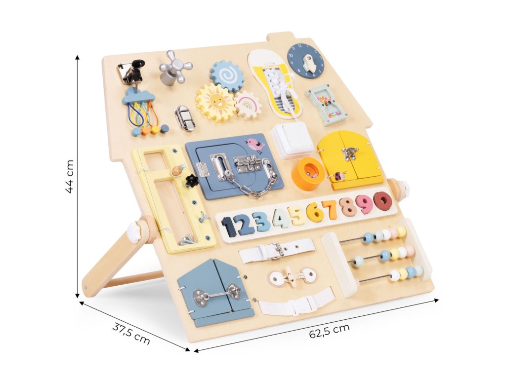 Dřevěná manipulační tabule – domeček. Pro děti od 3 let. Rozšířená edukativní tabule s mnoha prvky. Stabilní, dřevěná stojící konstrukce. Bezpečné zámky, čísla a šněrování. Hodiny, ozubená kola, otočný kohoutek a pásek s přezkou. Rozvíjí motoriku a logické myšlení. Akce–reakce – učení formou hry. Rozvoj hrou každý den. Dřevěná tabule s aktivitami je skvělým pomocníkem pro přirozený rozvoj dítěte. Díky prvkům jako zámečky, ozubená kola, počítadlo, hodiny či tkaničky si děti trénují zručnost, učí se logicky uvažovat a posilují samostatnost. Každý prvek motivuje k zkoušení a objevování, takže děti poznávají svět dotykem, pohybem a pozorováním. Stabilní konstrukce je pohodlná pro hru na podlaze a příjemné barvy se hodí do každého dětského pokoje. Funkce a vzdělávací prvky. Bota se šněrováním. Procvičuje koordinaci oko–ruka a vede k samostatnosti. Barevná čísla. Vložená do vyhrazených otvorů usnadňují počítání a rozpoznávání tvarů. Manipulace podporuje hmat i vizuální paměť. Malý schůdek/skříňka se šrouby. Dítě bezpečně zkouší otevírání, zavírání a povolování. Učí se základům fungování mechanizmů. Počítadlo s velkými dřevěnými kuličkami. Podporuje počítání, matematické dovednosti i obratnost prstů. Rozměry. Celková šířka: 62,5 cm. Celková hloubka: 37,5 cm. Celková výška: 44 cm. Rozměry tabule: 55 × 58 cm. Tloušťka desky: 1,2 cm. Specifikace. Věková kategorie: 3+ roky. Materiál: dřevo, kov, plast, textil. Hmotnost: 4 kg. Rozměr balení: 61 × 61 × 7,5 cm. Bezpečnostní upozornění. Výrobek je určen pro děti od 3 let a používá se pod dohledem dospělé osoby. Před každým použitím zkontrolujte stav všech částí. Při poškození výrobek nepoužívejte. Hrajte si na rovném, čistém a suchém povrchu. Zajistěte, aby se v dosahu nenacházely malé volné předměty. Obsahuje malé součásti. Nevhodné pro děti mladší 3 let – nebezpečí vdechnutí či spolknutí. Výrobek není prostředek osobní ochrany a nechrání před pády z výšky. Udržujte mimo dosah otevřeného ohně a zdrojů tepla. Čištění provádějte jemně vlhkým hadříkem. Nepoužívejte agresivní čisticí prostředky ani rozpouštědla. Barevnost a rozměry se mohou mírně lišit v rámci výrobních tolerancí a nastavení displeje.Doplňkové parametry