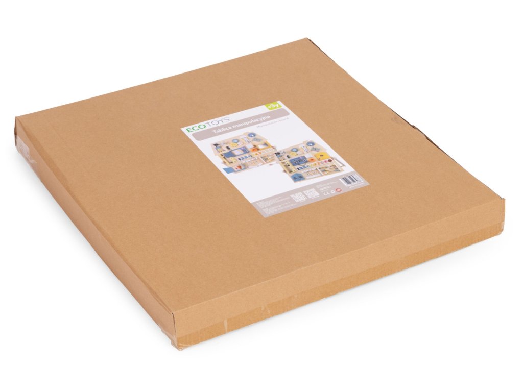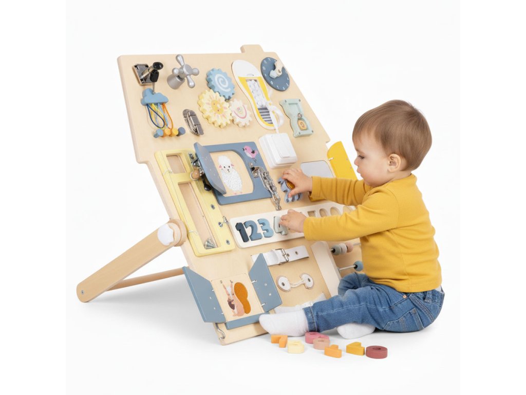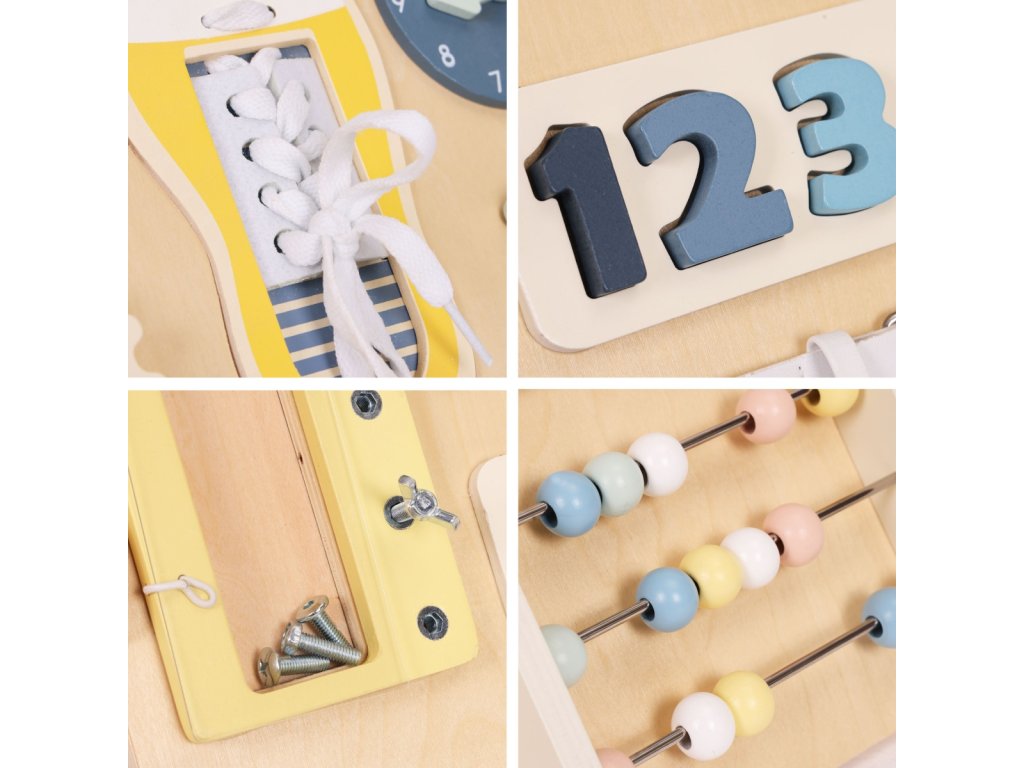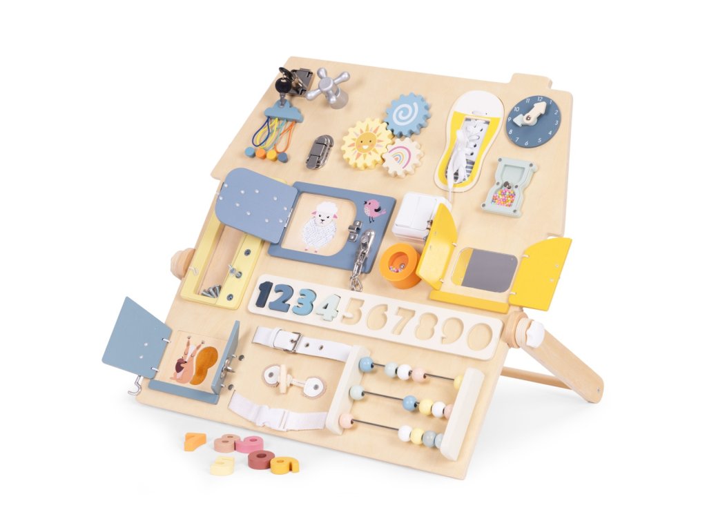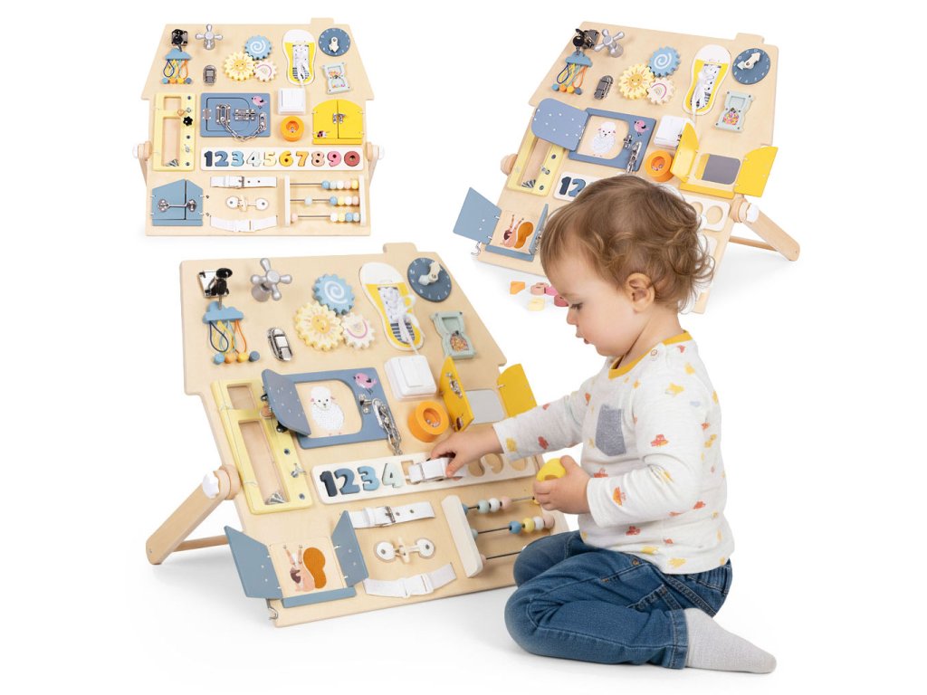 Dřevěná manipulační tabule – domeček. Pro děti od 3 let. Rozšířená edukativní tabule s mnoha prvky. Stabilní, dřevěná stojící konstrukce. Bezpečné zámky, čísla a šněrování. Hodiny, ozubená kola, otočný kohoutek a pásek s přezkou. Rozvíjí motoriku a logické myšlení. Akce–reakce – učení formou hry. Rozvoj hrou každý den. Dřevěná tabule s aktivitami je skvělým pomocníkem pro přirozený rozvoj dítěte. Díky prvkům jako zámečky, ozubená kola, počítadlo, hodiny či tkaničky si děti trénují zručnost, učí se logicky uvažovat a posilují samostatnost. Každý prvek motivuje k zkoušení a objevování, takže děti poznávají svět dotykem, pohybem a pozorováním. Stabilní konstrukce je pohodlná pro hru na podlaze a příjemné barvy se hodí do každého dětského pokoje. Funkce a vzdělávací prvky. Bota se šněrováním. Procvičuje koordinaci oko–ruka a vede k samostatnosti. Barevná čísla. Vložená do vyhrazených otvorů usnadňují počítání a rozpoznávání tvarů. Manipulace podporuje hmat i vizuální paměť. Malý schůdek/skříňka se šrouby. Dítě bezpečně zkouší otevírání, zavírání a povolování. Učí se základům fungování mechanizmů. Počítadlo s velkými dřevěnými kuličkami. Podporuje počítání, matematické dovednosti i obratnost prstů. Rozměry. Celková šířka: 62,5 cm. Celková hloubka: 37,5 cm. Celková výška: 44 cm. Rozměry tabule: 55 × 58 cm. Tloušťka desky: 1,2 cm. Specifikace. Věková kategorie: 3+ roky. Materiál: dřevo, kov, plast, textil. Hmotnost: 4 kg. Rozměr balení: 61 × 61 × 7,5 cm. Bezpečnostní upozornění. Výrobek je určen pro děti od 3 let a používá se pod dohledem dospělé osoby. Před každým použitím zkontrolujte stav všech částí. Při poškození výrobek nepoužívejte. Hrajte si na rovném, čistém a suchém povrchu. Zajistěte, aby se v dosahu nenacházely malé volné předměty. Obsahuje malé součásti. Nevhodné pro děti mladší 3 let – nebezpečí vdechnutí či spolknutí. Výrobek není prostředek osobní ochrany a nechrání před pády z výšky. Udržujte mimo dosah otevřeného ohně a zdrojů tepla. Čištění provádějte jemně vlhkým hadříkem. Nepoužívejte agresivní čisticí prostředky ani rozpouštědla. Barevnost a rozměry se mohou mírně lišit v rámci výrobních tolerancí a nastavení displeje.Doplňkové parametry