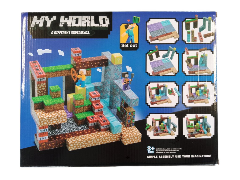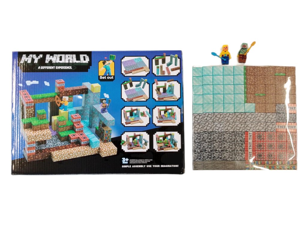 Stavebnice obsahuje 220 dílků včetně magnetických bloků a dvou herních postaviček s doplňky. Najdete zde kostky jako diamant, železo, zlato, kámen, tráva, bedrock, knihovny a samozřejmě výbušné TNT. Díky pestré nabídce prvků lze postavit rozsáhlé stavby, důlní komplexy, pevnosti nebo akční scény s příšerami a hrdiny.