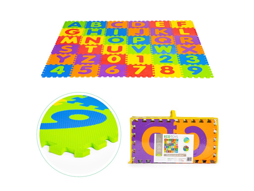PĚNOVÁ VZDĚLÁVACÍ PODLOŽKA – PUZZLE. Pro děti od 3 let. 36 barevných dílků (27 × 27 cm). Celkový rozměr 178 × 178 cm. Tloušťka podložky 0,9 cm. Podložka se spojuje na principu puzzle. Vyrobena z odolného materiálu EVA. Možnost vytvořit libovolný tvar podložky podle potřeby. Ideální na hraní i učení chůze. Vhodná na každý typ podlahy. Snadná údržba. Stačí otřít vlhkým hadříkem. Rozložená podložka chrání před chladem od podlahy. Bezpečné řešení pro děti. PERFEKTNÍ PRO DĚTI. Malé děti se nejlépe cítí na podlaze, kde mohou svobodně objevovat svět kolem sebe. Proto je důležité, aby měly měkké a pohodlné zázemí. Podložka poslouží k učení chůze i lezení, ke hře, odpočinku nebo jako pikniková deka. CHYTRÝ A BEZPEČNÝ DESIGN. Podložka se skládá z barevných čtverců se speciálními „zoubky“, díky nimž je lze snadno a pevně spojovat do různých tvarů. Tloušťka 0,9 cm přináší příjemnou měkkost a účinné tlumení pádů. Protiskluzová struktura zajišťuje stabilitu a bezpečí během hry. Na každém dílu jsou číslice a písmena, které podporují učení hrou a rozvíjejí dětskou zvědavost. 3D PUZZLE A TVOŘIVÁ ZÁBAVA. Protože se díly spojují jako puzzle, dítě z nich snadno postaví věž, kostky i další stavby podle fantazie. Každé písmeno i číslici lze vyjmout, takže se dá trénovat skládání slov, počítání i zábavné doplňování tvarů. SPECIFIKACE. Vhodné pro věk: 3+ roky. Materiál: EVA. Počet dílů: 36. Hmotnost: 2,4 kg. Balení: transportní taška se zapínáním na zip. Rozměr 1 dílu: 27 × 27 cm. Rozměr sestavené podložky: 178 × 178 cm. Tloušťka podložky: 0,9 cm. Rozměr balení: 62 × 32 × 17 cm. Zákonné informace a bezpečnostní upozornění. Výrobek je určen pro děti od 3 let. Používejte pod dohledem dospělé osoby. Před předáním dítěti odstraňte veškerý obalový materiál. Obal není hračka. Podložku používejte na rovném a čistém povrchu, mimo zdroje tepla a ostré předměty. Pravidelně kontrolujte stav výrobku. Při viditelném poškození výrobek nepoužívejte. Čištění: otírejte vlhkým hadříkem. Nepoužívejte agresivní chemické prostředky. Výrobek splňuje požadavky směrnice 2009/48/ES o bezpečnosti hraček a je označen CE.Doplňkové parametry