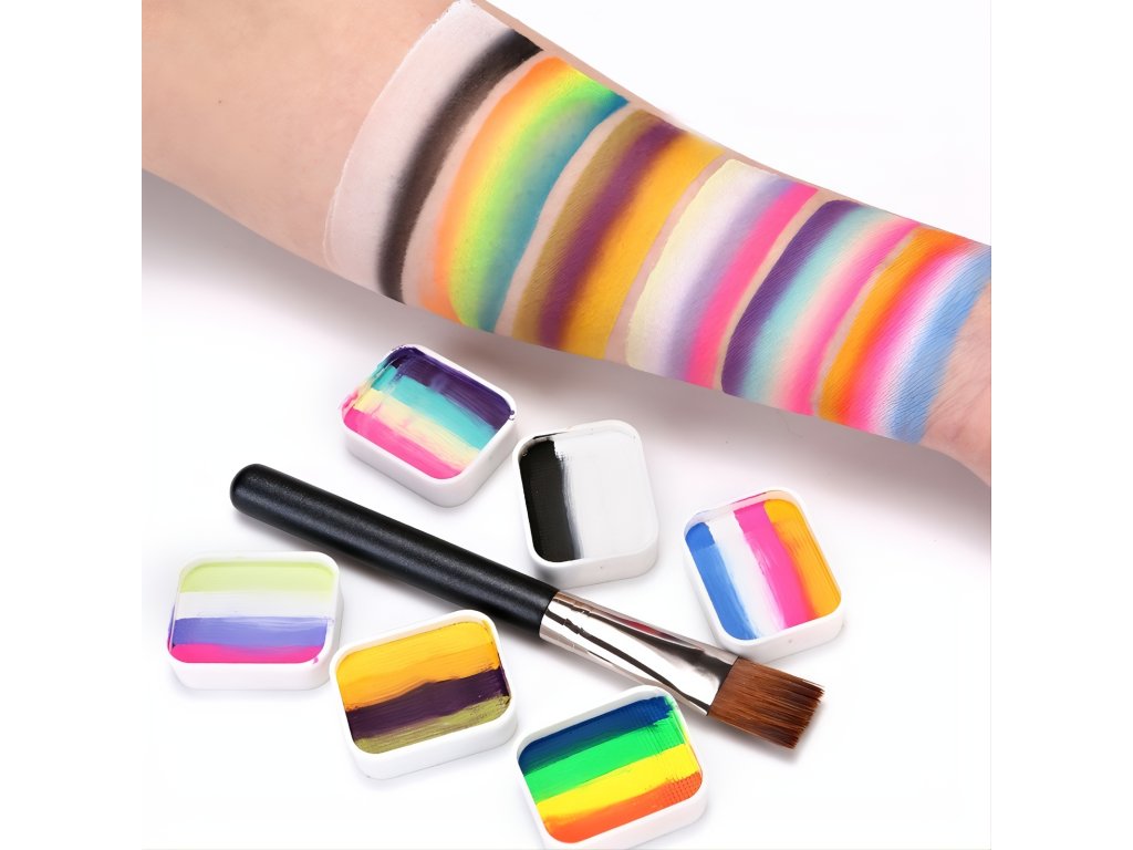 Obsahuje 10 palet se sytými barvami uspořádanými do pruhů pro snadné míchání a vytváření duhových efektů. Nechybí ani dvě základní barvy – bílá a černá. Barvy jsou na vodní bázi, snadno se nanášejí a smývají a jsou šetrné k dětské pokožce.