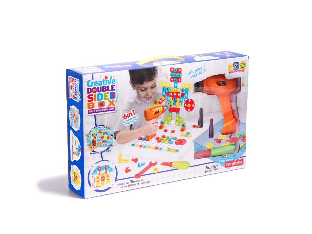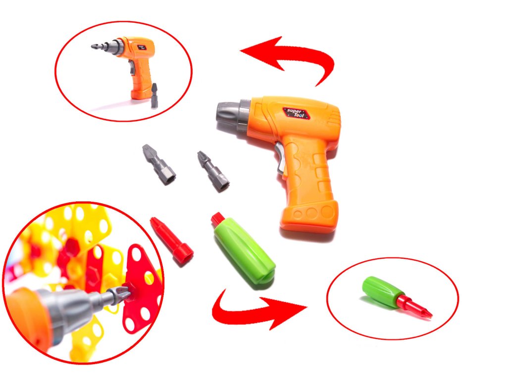 Vzdělávací sada vrtačky a vrtáku pro malého kutila v přenosném kufříku. Hra spočívá v zašroubování barevných šroubku do desky pomocí vrtačky nebo vrtáku. Sada nabízí vytvoření nekonečného množství 2D postaviček a tvaru. Vaše dítě se zabaví na dlouhé hodiny připevňováním matek, šroubů a šablon k desce pomocí akumulátorové vrtačky nebo šroubováku. Sada rozvíjí kreativitu, matematické a logické myšlení. Sada obsahuje 261 dílu.