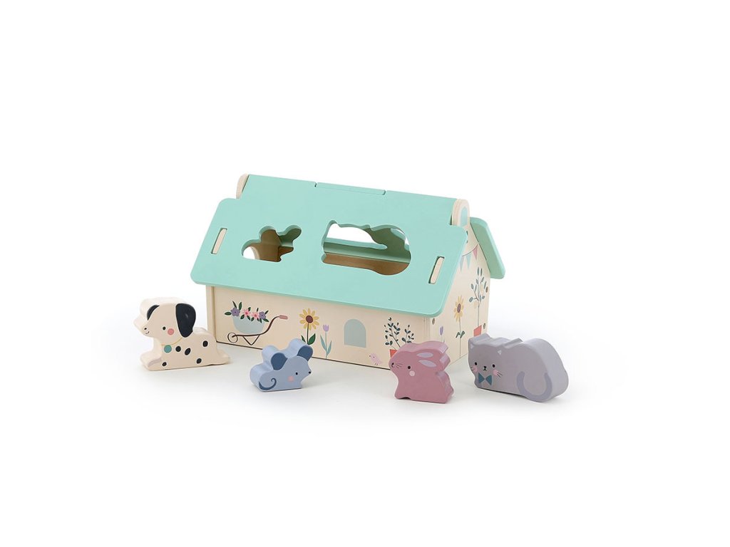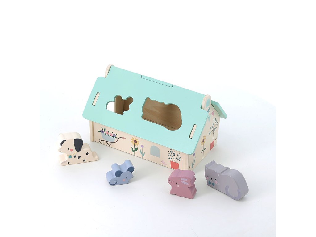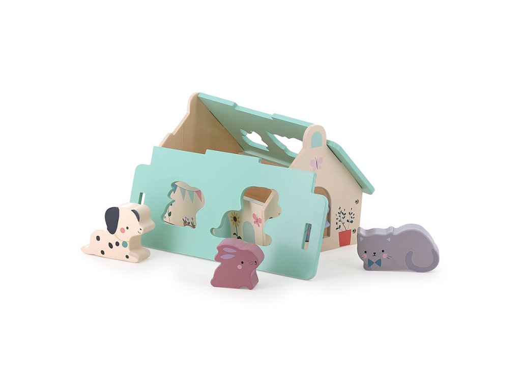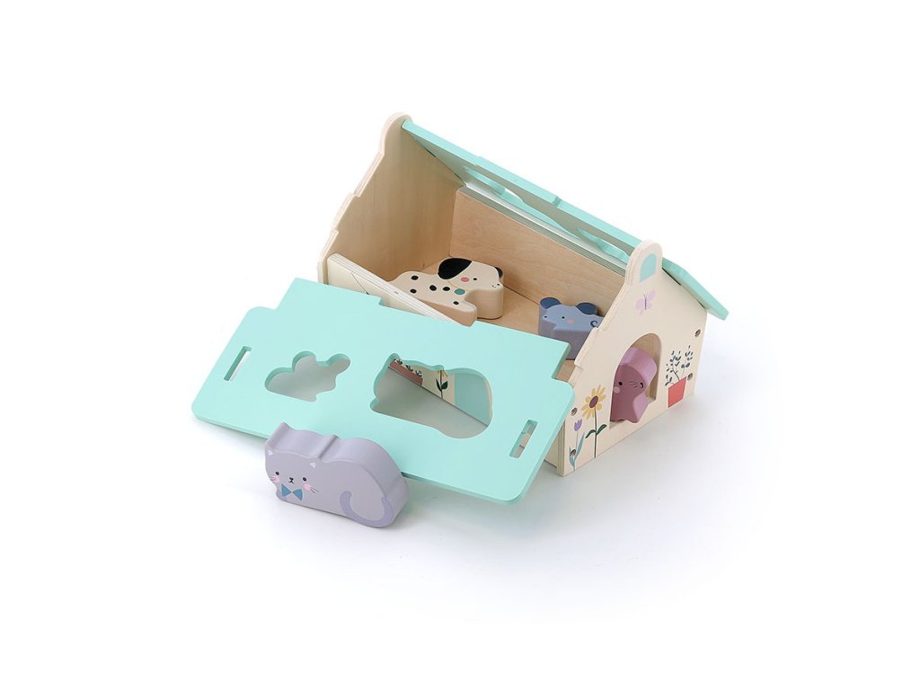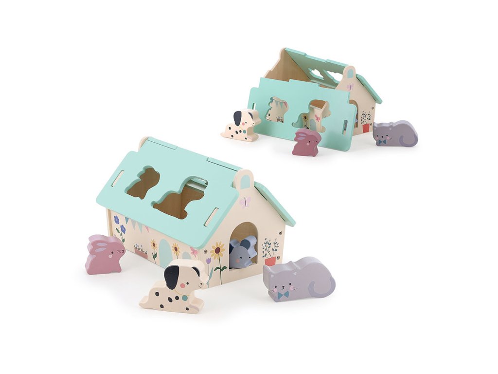 Kdopak to bydlí v tomto malebném dřevěném domečku? Pejsek, myška, kočička a králík. Vkládačka ve tvaru domečku podle návrhu Sarah Betz potěší každé dítě. Domeček v jemných barvách s motivy květin má odnímatelnou střechu s tvarovanými otvory pro vkládání zvířátek. Jedná se o ranou hračku inspirovanou Montessori. Při hře děti rozvíjejí mnoho dovedností jako je soustředění, obratnost, motorika, trpělivost a koordinace ruka-oko. Naučí se manipulovat se zvířátky tak, aby se vešla do odpovídajících otvorů a rozvíjejí svou představivost, když si budou jen tak hrát s s figurkami zvířátek a domečkem. Hlavní vlastnosti: domeček s odnímatelnou střechou, 4 zvířátka – pejsek, myška, kočka, králíknápaditý design Sarah Betzhračka inspirovaná Montessorirozvíjí obratnost, koordinaci ruka-oko a trpělivostpodporuje představivost a soustředěníDoplňkové parametry