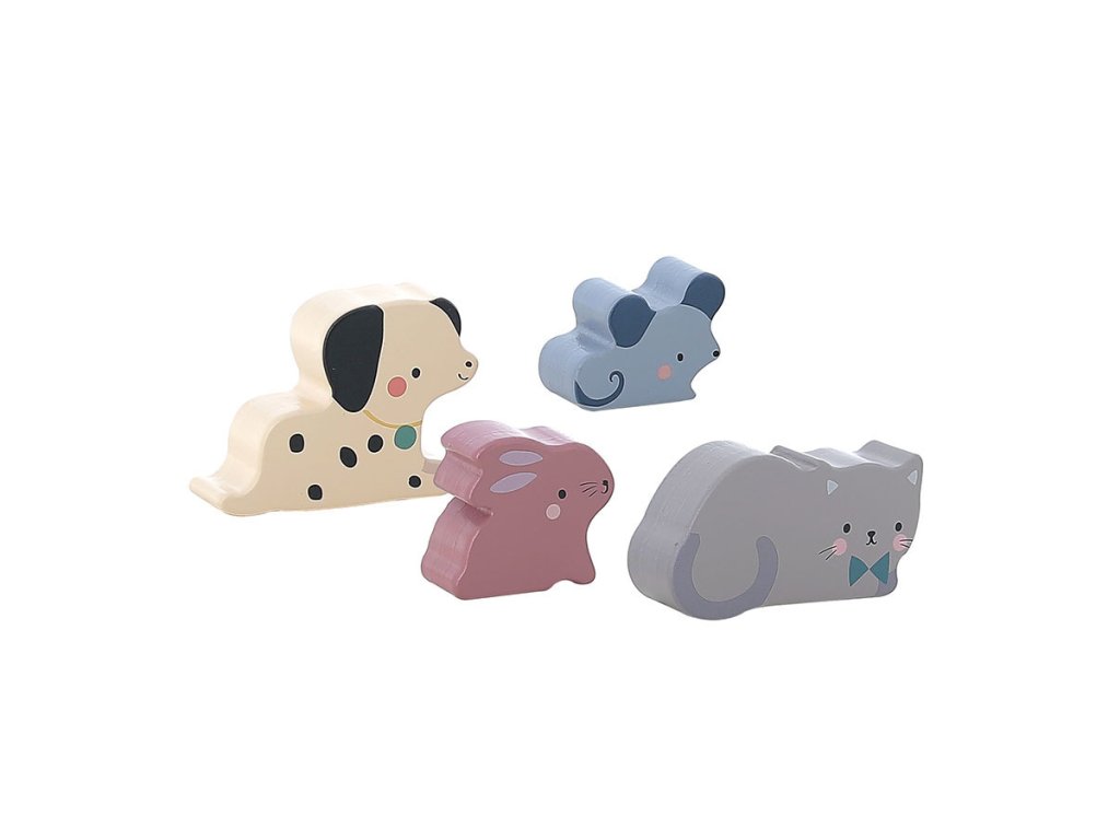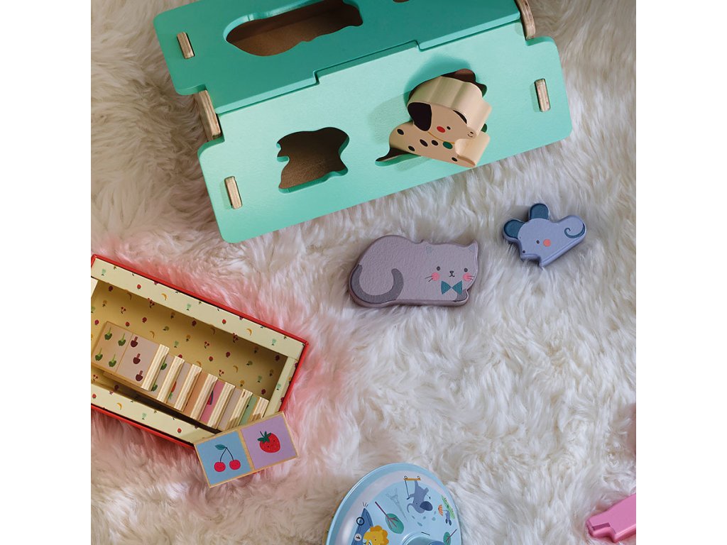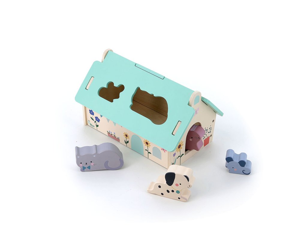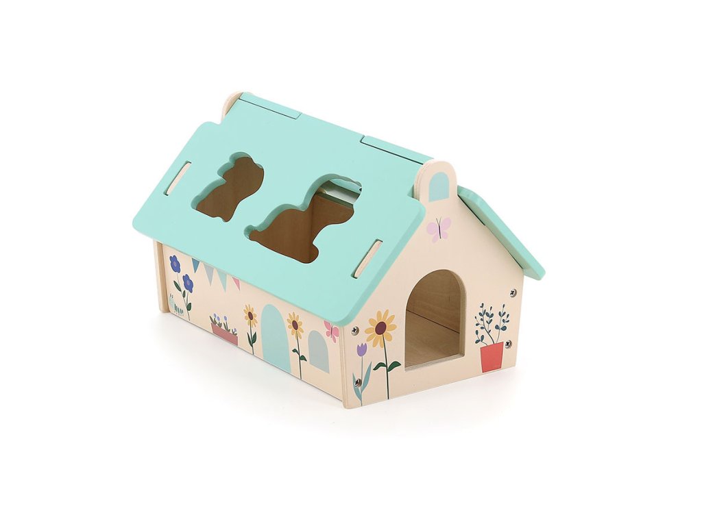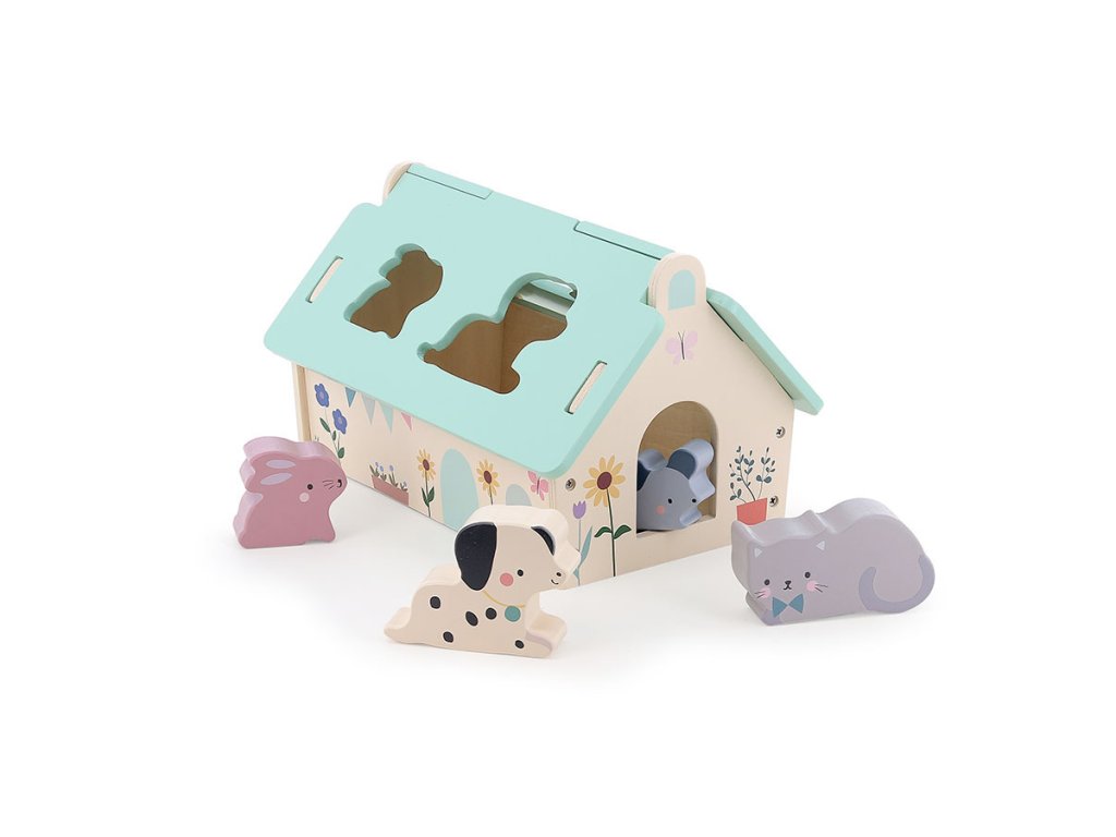 Kdopak to bydlí v tomto malebném dřevěném domečku? Pejsek, myška, kočička a králík. Vkládačka ve tvaru domečku podle návrhu Sarah Betz potěší každé dítě. Domeček v jemných barvách s motivy květin má odnímatelnou střechu s tvarovanými otvory pro vkládání zvířátek. Jedná se o ranou hračku inspirovanou Montessori. Při hře děti rozvíjejí mnoho dovedností jako je soustředění, obratnost, motorika, trpělivost a koordinace ruka-oko. Naučí se manipulovat se zvířátky tak, aby se vešla do odpovídajících otvorů a rozvíjejí svou představivost, když si budou jen tak hrát s s figurkami zvířátek a domečkem. Hlavní vlastnosti: domeček s odnímatelnou střechou, 4 zvířátka – pejsek, myška, kočka, králíknápaditý design Sarah Betzhračka inspirovaná Montessorirozvíjí obratnost, koordinaci ruka-oko a trpělivostpodporuje představivost a soustředěníDoplňkové parametry