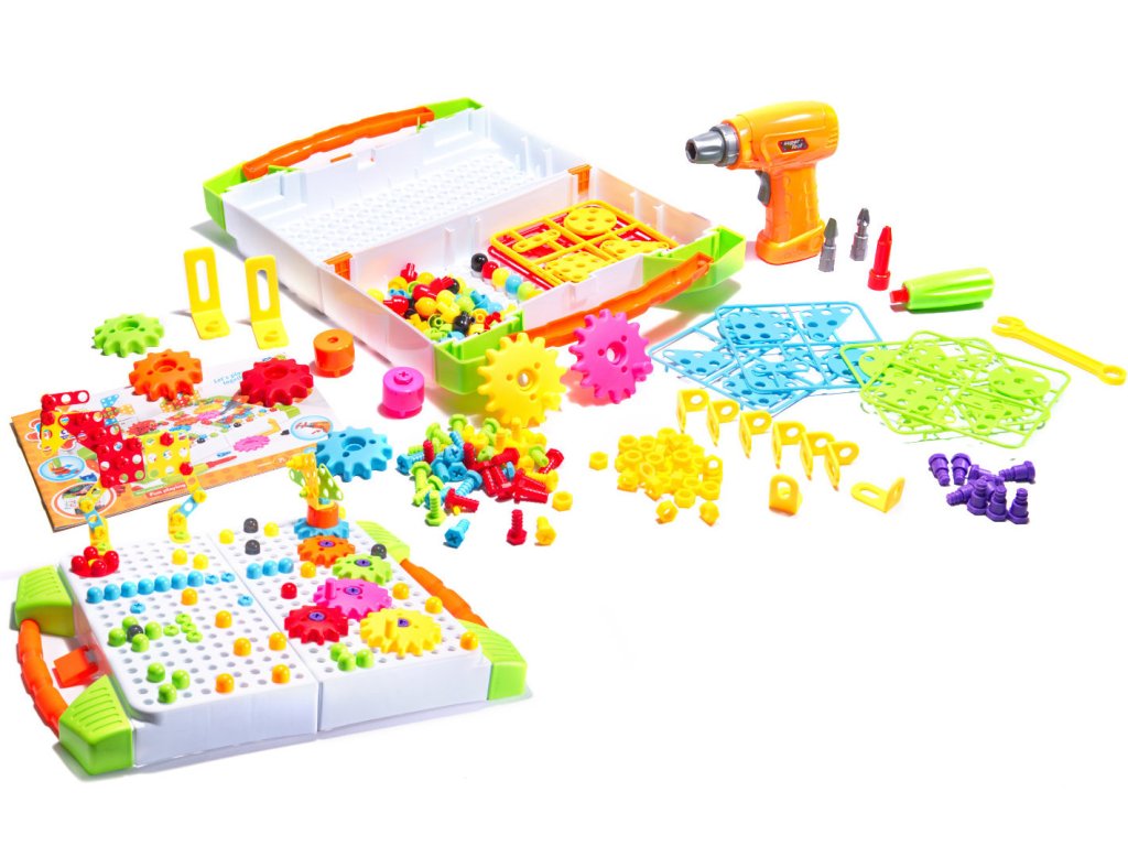 Vzdělávací sada vrtačky a vrtáku pro malého kutila v přenosném kufříku. Hra spočívá v zašroubování barevných šroubku do desky pomocí vrtačky nebo vrtáku. Sada nabízí vytvoření nekonečného množství 2D postaviček a tvaru. Vaše dítě se zabaví na dlouhé hodiny připevňováním matek, šroubů a šablon k desce pomocí akumulátorové vrtačky nebo šroubováku. Sada rozvíjí kreativitu, matematické a logické myšlení. Sada obsahuje 181 dílu.
