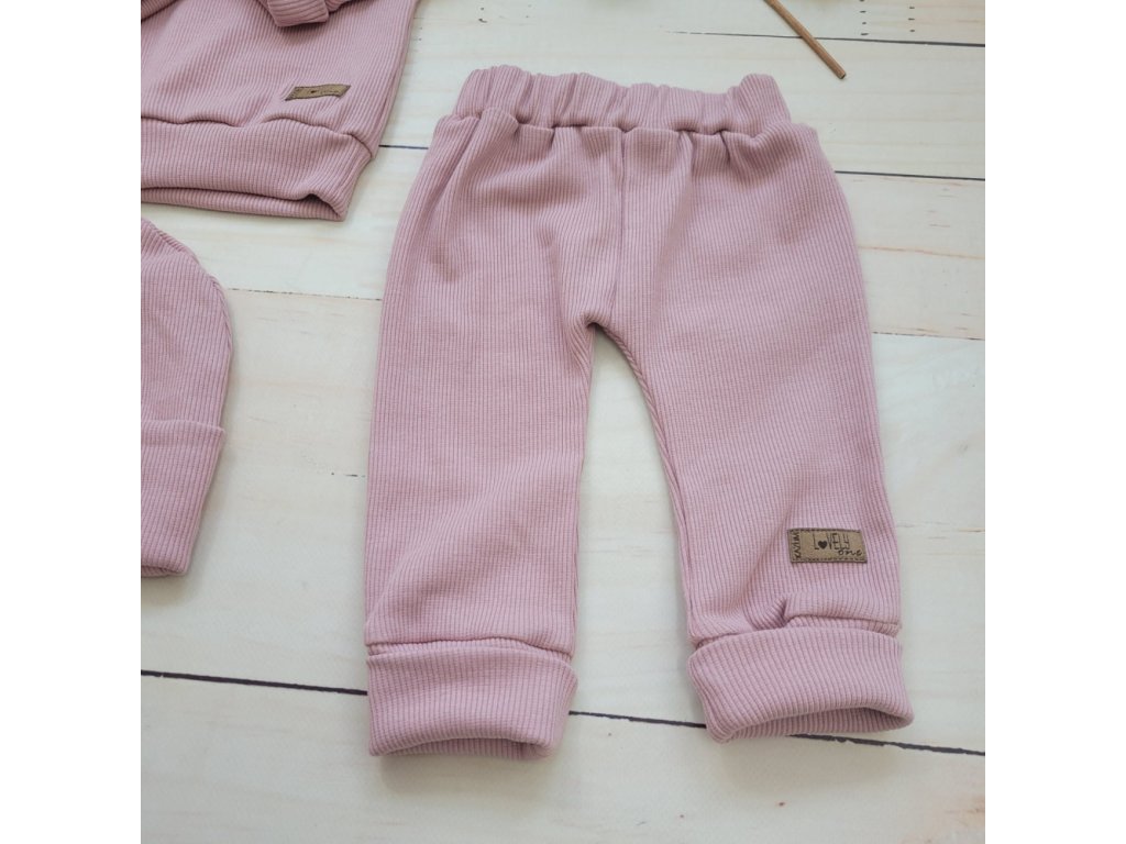 3-dílná souprava z žebrovaného úpletu. Mikina má zapínání u krku na cvočky. Zaručuje pohodlí a pohodlí při oblékání. Perfektní pro každé roční období. Dlouhé manžety na rukávech umožňují mikině růst s dítětem. Kalhoty mají velmi elastický pás, díky kterému se kalhoty přizpůsobí každé postavě a prodloužené manžety ve spodní části navíc umožní kalhotám růst s dítětem. Sada obsahuje: Mikinku, tepláčky a čepičku. Materiál: 95% Bavlna 5% elastan. Detailní rozměry:Tepláčky: Vel. 56/62 - délka 35 cm, pas - 16 cm x 2. Vel. 68/74 - délka 41 cm, pas - 21 cm x 2. Vel. 80/86 - délka 48 cm, pas - 23 cm x 2. Detailní rozměry:Mikina: Vel. 56/62 - délka 28 cm, hrudník - 22 cm x 2, rukáv od krku 25 cm. Vel. 68/74- délka 30 cm, hrudník - 27 cm x 2, rukáv od krku 28 cm. Vel. 80/86 - délka 33 cm, hrudník - 28 cm x 2, rukáv od krku 31 cm. Detailní rozměry:Čepice: Vel. 56/62 - průměr 16 cm, hloubka 16 cm. Vel. 68/74 - průměr 18 cm, hloubka 18 cm. Vel. 80/86 - průměr 19 cm, hloubka 19 cm. Uvedené rozměry se mohou lišit +- 1-2cm. Při údržbě/praní se vždy řiďte pokyny uvedenými na štítku výrobce!Doplňkové parametry