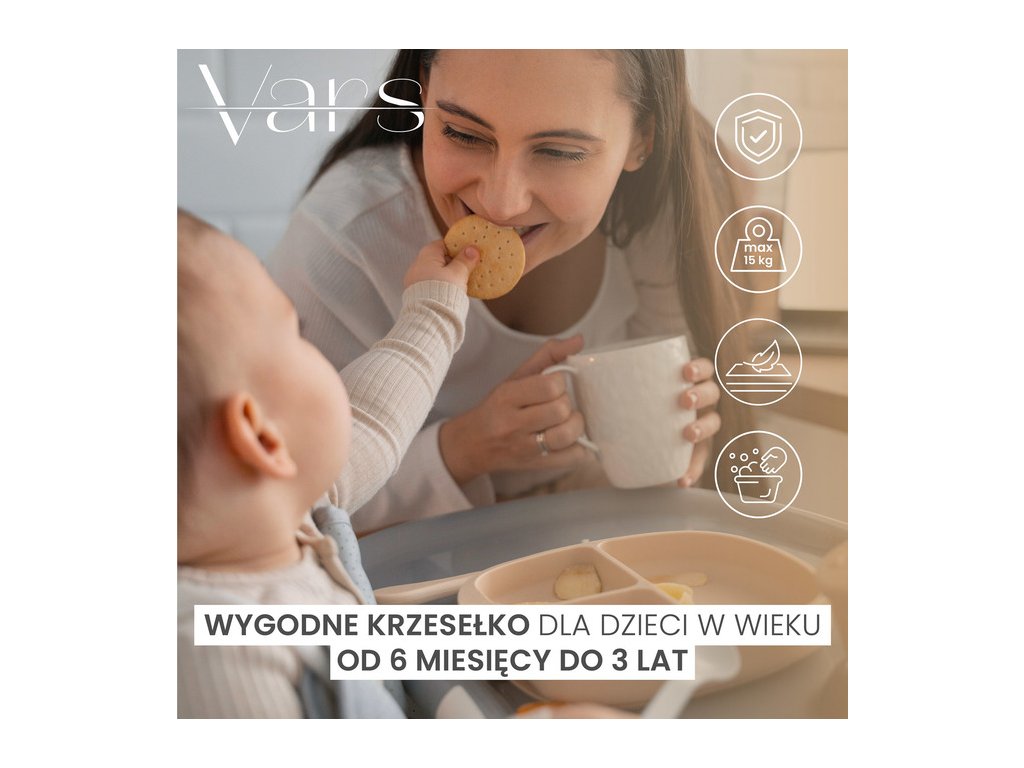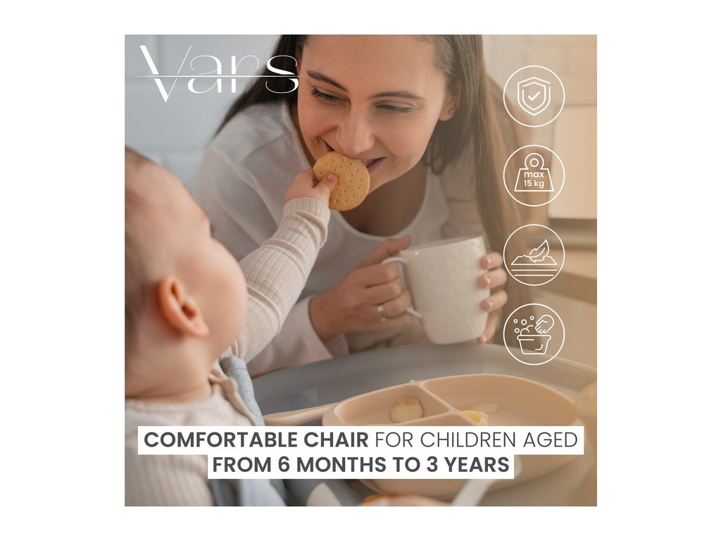 Jídelní židlička pro miminka a děti Vars. ROSTE SPOLU S DÍTĚTEM. Hledáte multifunkční jídelní židličku, která poroste spolu s vaším dítětem? Vars je ideální volbou pro děti od 6 měsíců do 3–4 let. Nabízí maximální pohodlí, bezpečnost a stylový design, který se dokonale hodí do moderní domácnosti. Vars je špičková jídelní židlička, ideální pro děti od 6 měsíců do přibližně 3–4 let s maximální nosností 15 kg. MULTIFUNKČNOST. Židlička je vybavena nastavitelným opěradlem a podnožkou, což z ní činí perfektní volbu jak pro kojence, tak pro starší děti. Může sloužit jako jídelní židlička nebo pohodlné místo pro odpočinek. 6-STUPŇOVÉ NASTAVENÍ VÝŠKY. Díky 6 stupňovému nastavení výšky a možnosti demontáže pultíku lze židličku snadno přizpůsobit výšce jakéhokoliv stolu. Nastavitelná vzdálenost pultíku od sedáku umožňuje optimální přizpůsobení aktuálním potřebám vašeho dítěte. BEZPEČNOST NA PRVNÍM MÍSTĚ. Židlička je vybavena 5bodovými bezpečnostními pásy s nastavitelnou délkou, které účinně chrání dítě před vypadnutím. Protiskluzové gumové podložky na rámu zabraňují posouvání židličky a zároveň chrání podlahy před poškrábáním. SNADNÁ ÚDRŽBA. Sedák je vyroben z materiálů odolných vůči skvrnám, což zajišťuje snadné čištění. Potah lze jednoduše sejmout a vyprat. Navíc praktická odnímatelná vrchní část pultíku umožňuje rychlé a pohodlné úklid po jídle. STYLOVÝ A PRAKTICKÝ DESIGN. Moderní židlička Vars spojuje funkčnost s elegantním vzhledem, který skvěle zapadne do každého moderního interiéru. Snadná demontáž a kompaktní rozměry po složení usnadňují skladování, a to i v menších bytech. KVALITA A PRAKTICKÉ DOPLŇKY. Židlička byla navržena pro maximální komfort a dlouhou životnost za použití materiálů nejvyšší kvality. Součástí příslušenství je i praktická taška na drobnosti, která usnadňuje organizaci během jídla. Zvolte Vars – kombinaci bezpečnosti, praktičnosti a stylu, která roste spolu s vaším dítětem! Výrobce. IKS 2 Mucha Sp. J. Rybnicka 9 43-190 Mikołów iks2@iks2.plDoplňkové parametry