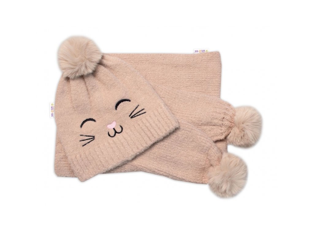 Zimní čepice s bambulí + šál, Kitty, Baby Nellys - cappuccino, vel. 54/58