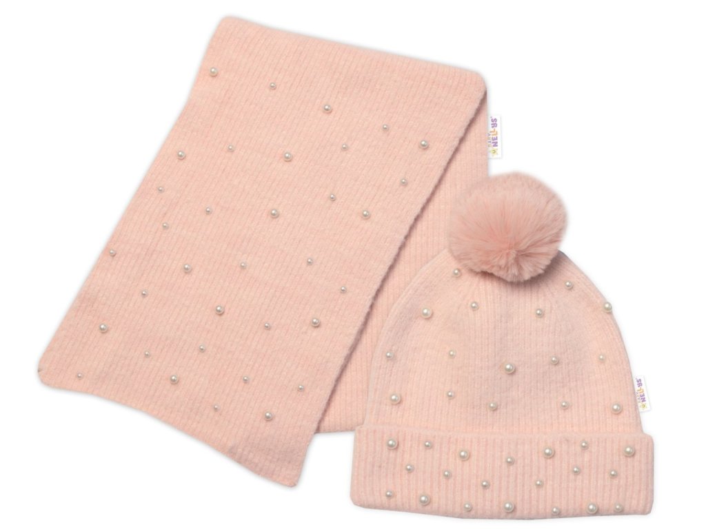 Zimní čepice s bambulí + šál, Pearls, Baby Nellys - pudrově růžová, vel. 54/58